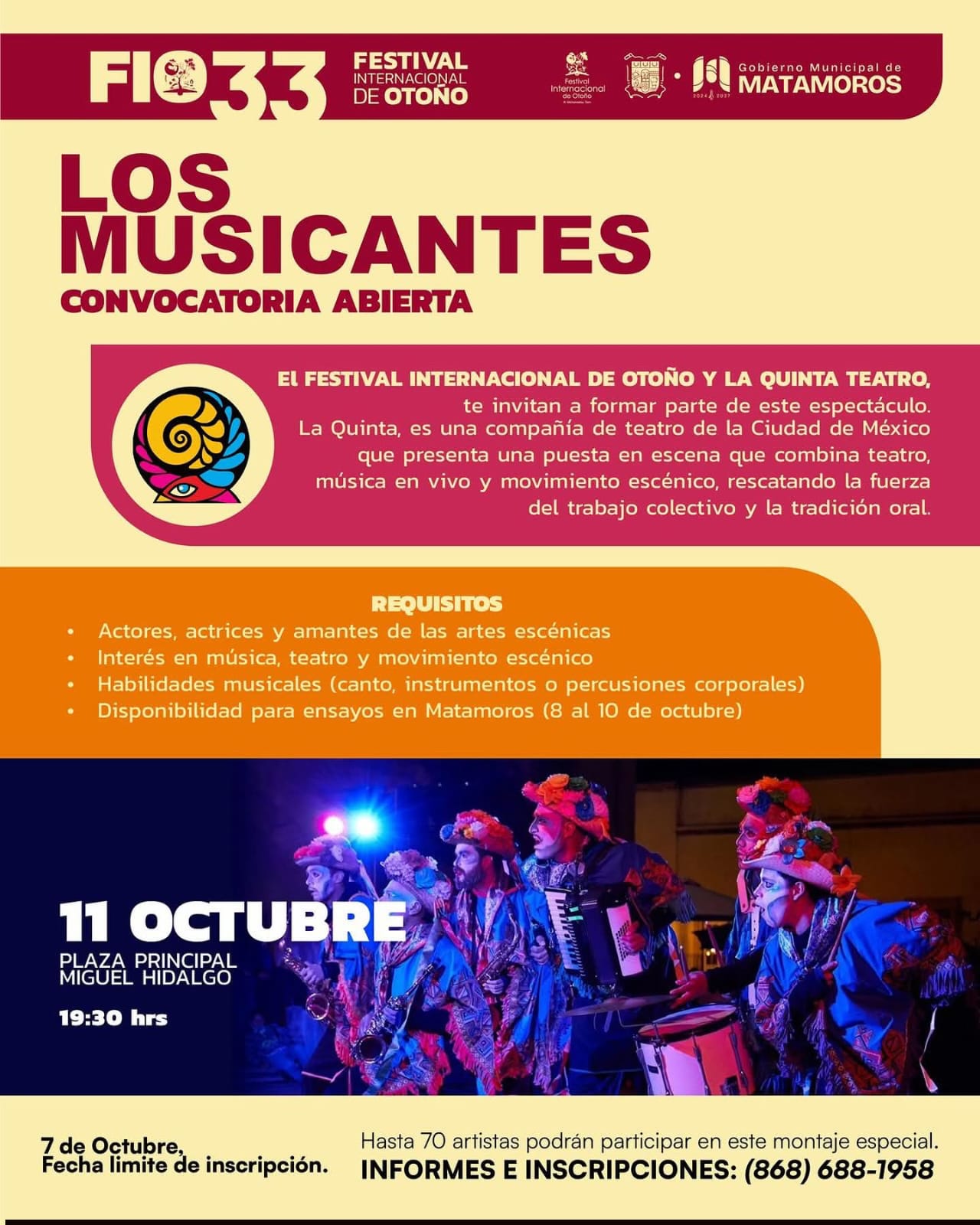 H. Matamoros, Tamaulipas.- El gobierno municipal que encabeza Beto Granados lanzó una invitación abierta a la comunidad artística y al público en general para participar en la convocatoria del espectáculo Los Musicantes, una propuesta escénica que será presentada como parte del Festival Internacional de Otoño (FIO33). Esta iniciativa busca reunir a actores, actrices y amantes de las artes escénicas en un montaje que fusiona teatro, música en vivo y movimiento escénico. La puesta en escena estará a cargo de La Quinta Teatro, una reconocida compañía que apuesta…