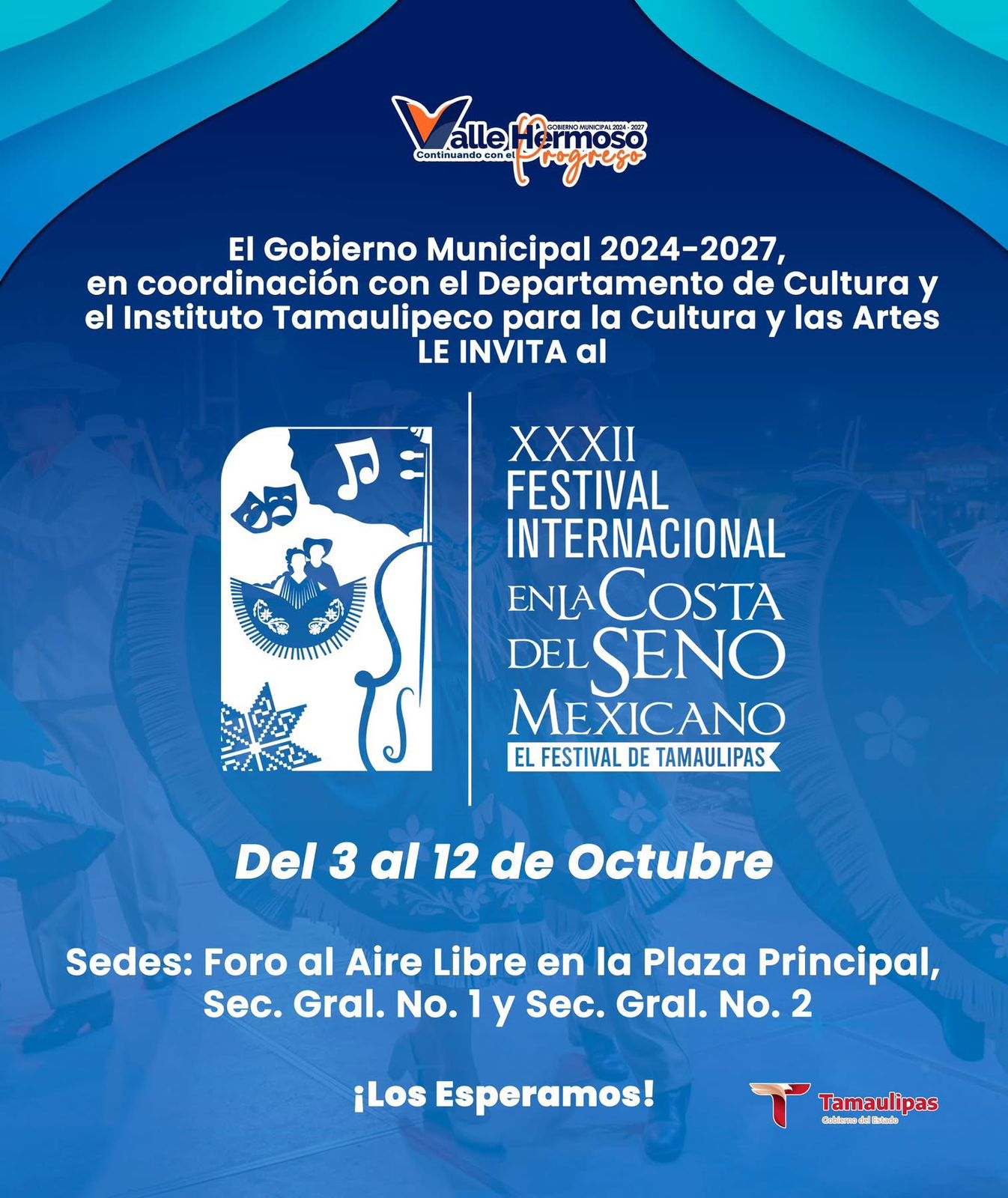 El Gobierno Municipal 2024–2027, que preside el Dr. Alberto Alanis Villarreal, en coordinación con el Departamento de Cultura y el Instituto Tamaulipeco para la Cultura y las Artes les invita al XXXII Festival Internacional en la Costa del Seno Mexicano. Este evento, que reúne arte, música y talento, se llevará a cabo en distintos escenarios al aire libre de nuestra ciudad, como el Teatro de la Plaza Principal, la Secundaria General No. 1 y la Secundaria General No. 2, del 3 al 12 de octubre. Una celebración…