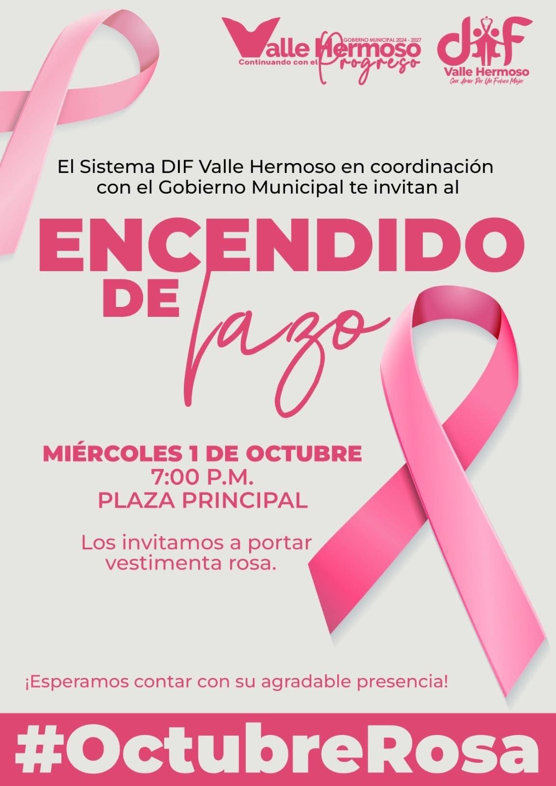 El Sistema DIF Valle Hermoso y el Gobierno Municipal los invitamos al Encendido del Lazo Rosa, a celebrarse hoy miércoles 1 de octubre, a las 7 de la tarde, en la plaza principal.