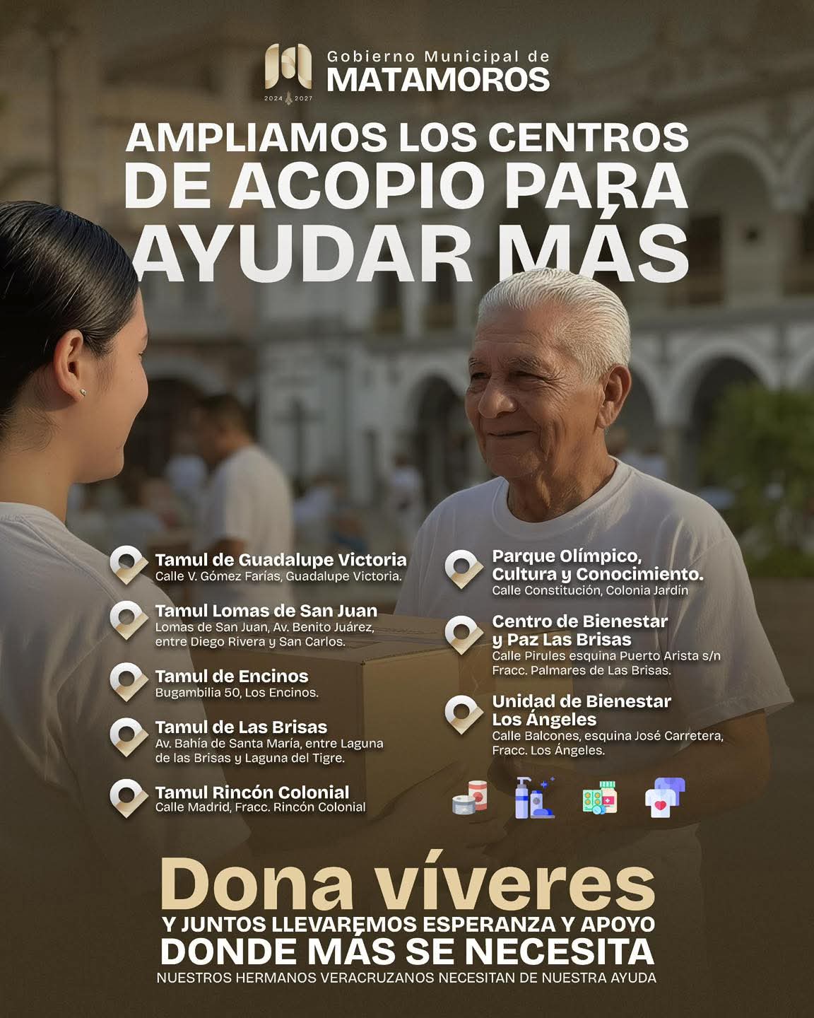 12 de Octubre de 2025 H. Matamoros, Tamaulipas.- Con el propósito de facilitar la entrega de víveres y brindar un mayor apoyo a quienes hoy más lo necesitan, el gobierno municipal que preside el alcalde, Beto Granados, ha ampliado los centros de acopio disponibles en la comunidad. Cada donación representa esperanza, solidaridad y un abrazo fraterno hacia nuestros hermanos veracruzanos. “En momentos difíciles, la unidad de nuestra gente marca la diferencia. Invitamos a toda la ciudadanía a sumarse a esta causa humanitaria que refleja lo mejor de nuestro municipio,…