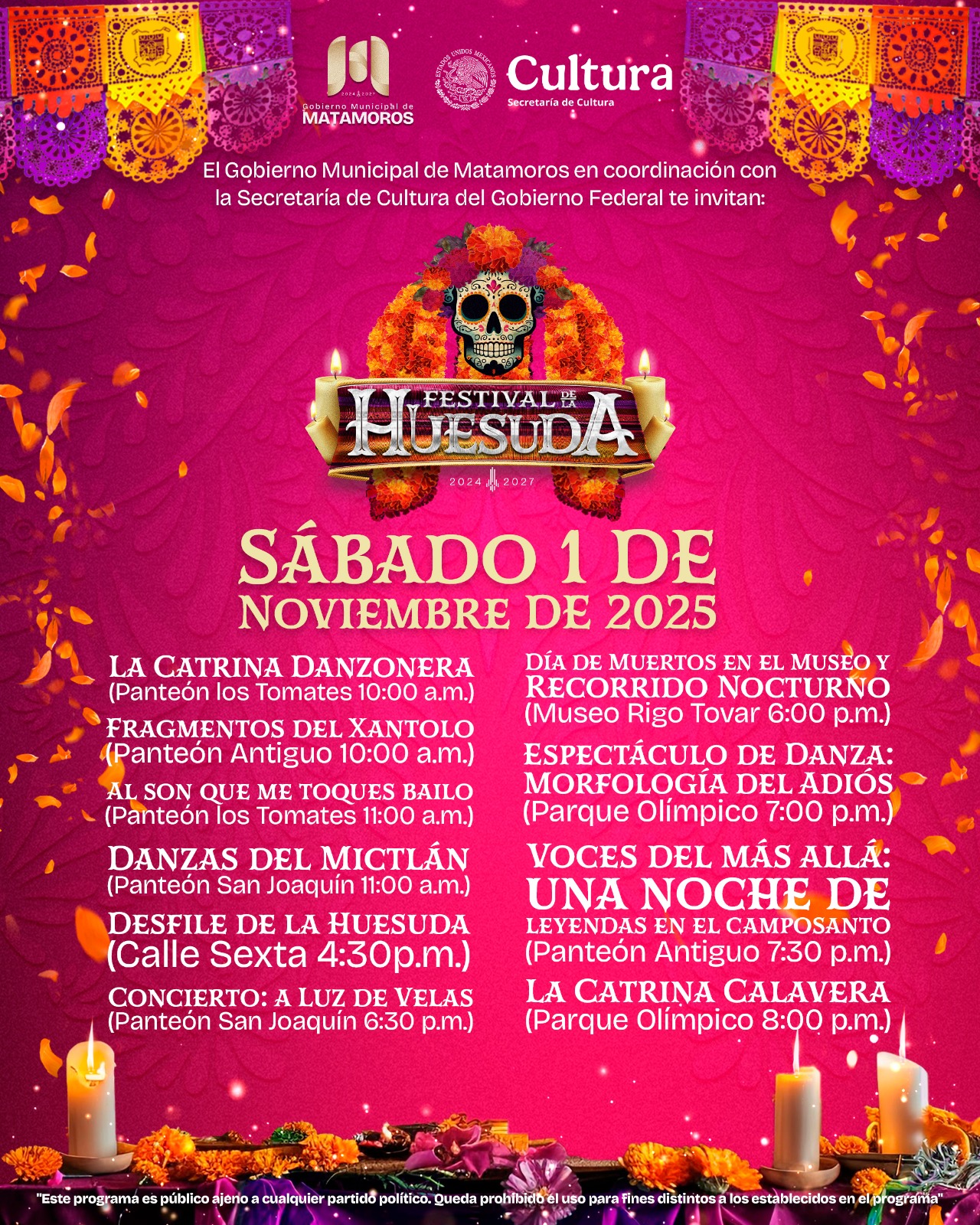 01 de Noviembre de 2025 H. Matamoros, Tamaulipas.- El alcalde Beto Granados invita a los matamorenses a disfrutar del Festival de la Huesuda 2025, que continúa este sábado 1 de noviembre con un día lleno de tradición, arte y cultura que te hará vibrar. Desde los panteones hasta el Parque Olímpico, Matamoros se transforma en un gran escenario donde la música, la danza y las leyendas rinden homenaje a quienes nos precedieron. Ven y sé parte del Desfile de la Huesuda, disfruta de espectáculos únicos y…