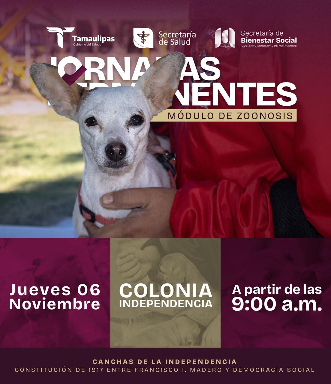 06 de Noviembre de 2025 H. Matamoros, Tamaulipas.- Porque su bienestar también importa, este jueves, el módulo de zoonosis llegará a la Colonia Independencia para ofrecer servicios gratuitos de atención y cuidado para tus mascotas. A partir de las 9:00 de la mañana, podrán acudir los interesados a las canchas de la Independencia (Constitución de 1917 entre Francisco I. Madero y Democracia Social) y aprovechar esta jornada dedicada a la salud y el bienestar de nuestros amigos de cuatro patas. Con acciones como esta, el Gobierno…