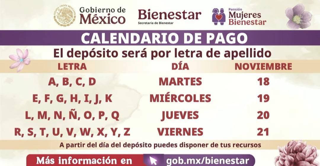 MUJERES DE 60, 61 y 62 AÑOS QUE SE REGISTRARON EN EL MES DE AGOSTO Como se dio a conocer anteriormente el día de hoy Inician los depósitos y terminara el día 21 de noviembre, 𝘀𝗶𝗴𝘂𝗶𝗲𝗻𝗱𝗼 𝗹𝗮 𝗹𝗲𝘁𝗿𝗮 𝗱𝗲𝗹 𝗽𝗿𝗶𝗺𝗲𝗿 𝗮𝗽𝗲𝗹𝗹𝗶𝗱𝗼. De esta forma c𝗮𝘀𝗶 𝟮 𝗺𝗶𝗹𝗹𝗼𝗻𝗲𝘀 𝗱𝗲 𝗺𝘂𝗷𝗲𝗿𝗲𝘀 𝗱𝗲 𝟲𝟬 𝗮 𝟲𝟮 𝗮𝗻̃𝗼𝘀 𝗿𝗲𝗰𝗶𝗯𝗶𝗿𝗮́𝗻 𝗽𝗼𝗿 𝗽𝗿𝗶𝗺𝗲𝗿𝗮 𝘃𝗲𝘇 𝘀𝘂 𝗽𝗮𝗴𝗼 𝗱𝗲 𝗹𝗮 Pensión Mujeres Bienestar. Este es el calendario.