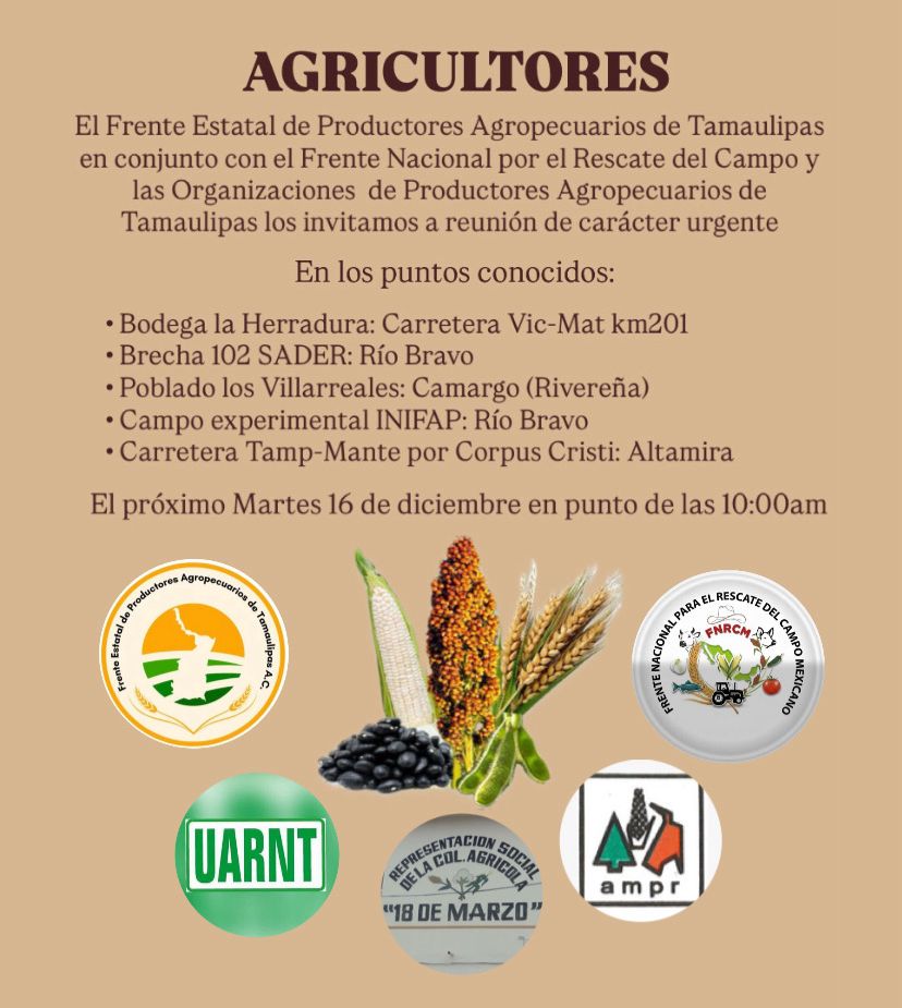 AGRICULTORES: El Frente Estatal de Productores Agropecuarios de Tamaulipas en conjunto con el Frente Nacional por el Rescate del Campo y las Organizaciones de Productores Agropecuarios de Tamaulipalos invitamos aúna Reunión de carácter urgente. En los puntos conocidos ■ Bodega La Herradura: CarreteraVictoria-Matamoros kilómetro 201 ■ Brecha 102 SADER: Río Bravo ■ Poblado Los Villarreales; Camargo (Ribereña) ■ Campo Experimental INIFAP: Río Bravo ■ Carretera Tamp-Mante por Corpus Cristi: Altamira ● El próximo Martes 16 de diciembre en punto de las 10:00 a.m.