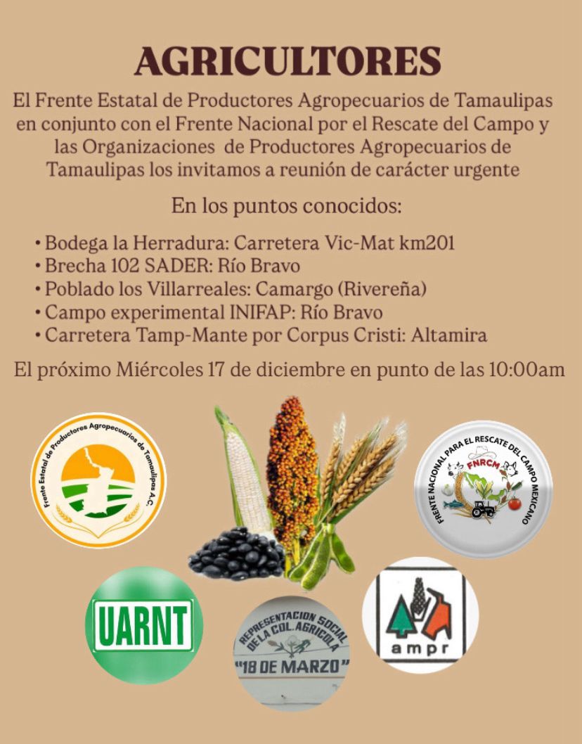 AGRICULTORES: El Frente Estatal de Productores Agropecuarios de Tamaulipas en conjunto con el Frente Nacional por el Rescate del Campo y las Organizaciones de Productores Agropecuarios de Tamaulipalos invitamos aúna Reunión de carácter urgente. En los puntos conocidos: ■ Bodega La Herradura: CarreteraVictoria-Matamoros kilómetro 201 ■ Brecha 102 SADER: Río Bravo ■ Poblado Los Villarreales; Camargo (Ribereña) ■ Campo Experimental INIFAP: Río Bravo ■ Carretera Tamp-Mante por Corpus Cristi: Altamira ● El próximo Miércoles 17 de diciembre en punto de las 10:00 a.m.