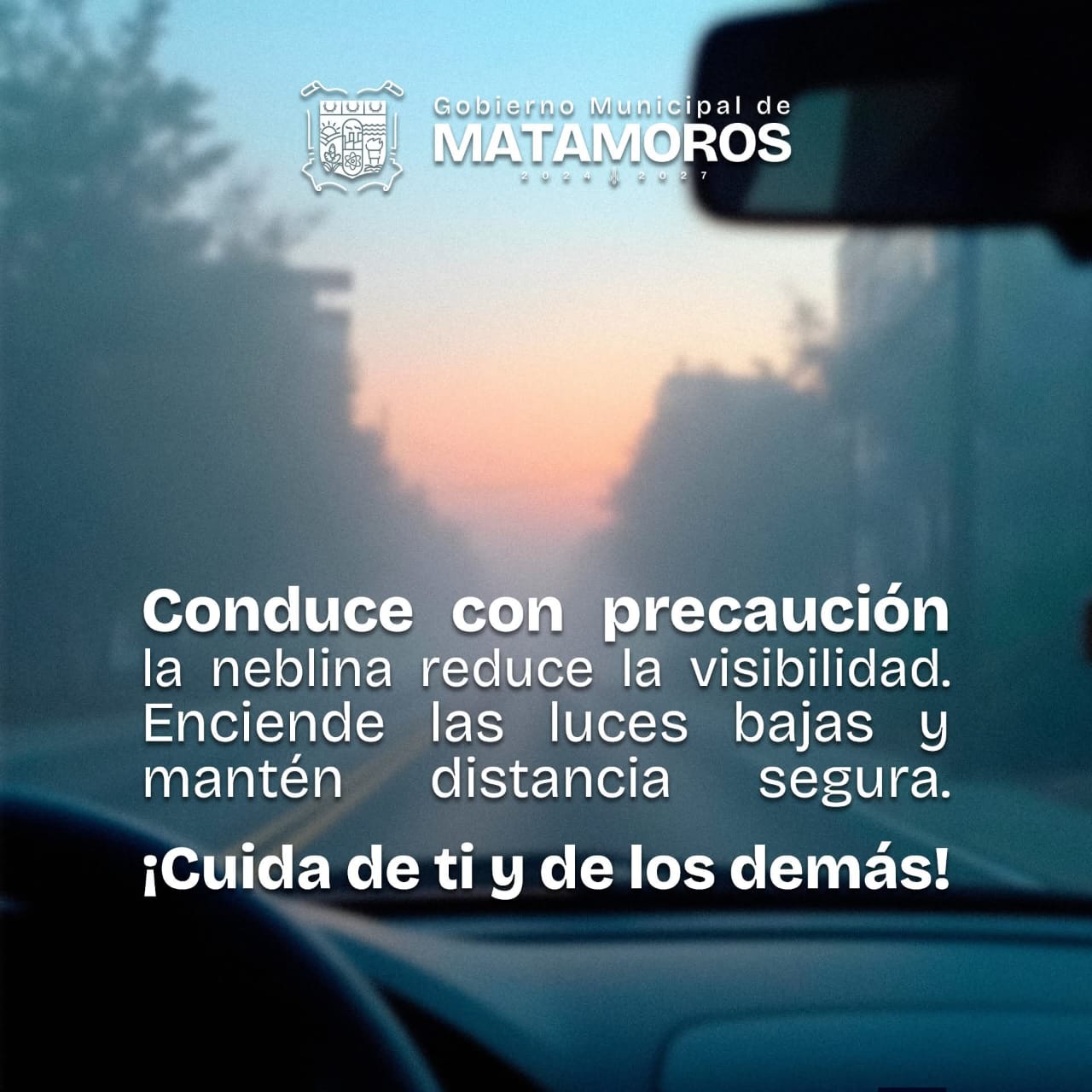 27 de Diciembre de 2025 H. Matamoros, Tamaulipas.- Ante la presencia de neblina en distintos puntos de la ciudad, el Gobierno Municipal de Matamoros, encabezado por el alcalde Beto Granados, exhorta a la ciudadanía a extremar precauciones al conducir, ya que estas condiciones reducen considerablemente la visibilidad. Para evitar accidentes, se recomienda encender las luces bajas, mantener una distancia segura entre vehículos, reducir la velocidad y conducir con total responsabilidad, priorizando siempre la seguridad propia y la de los demás. Cuidarnos es tarea de todos. Con…