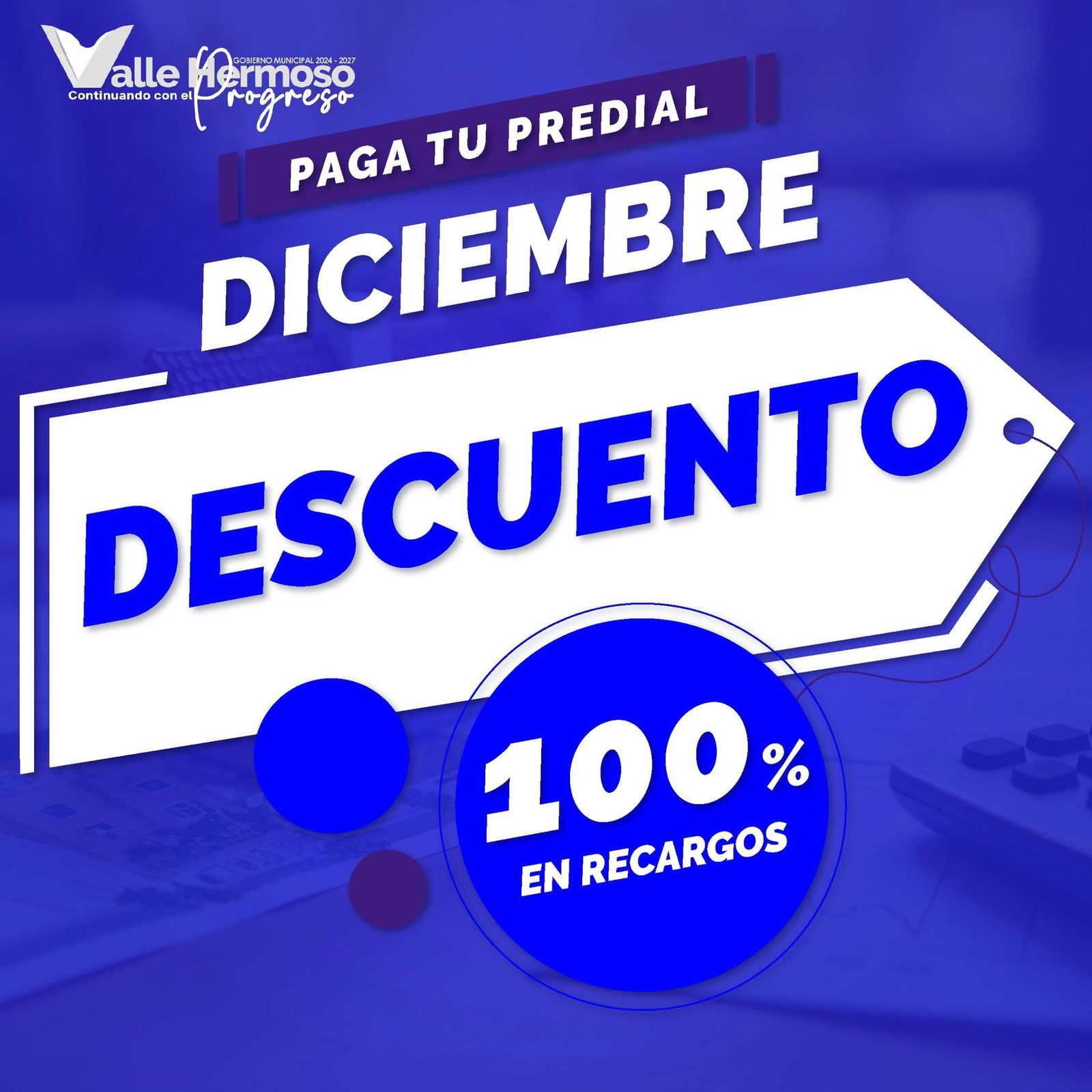 El Gobierno Municipal de Valle Hermoso, presidido por el alcalde Dr. Alberto Alanís Villarreal, informa a la ciudadanía que durante todo el mes de diciembre se aplicará un 100% de descuento en los recargos del pago del impuesto predial. Se exhorta a todos los contribuyentes a aprovechar este beneficio y acudir a la Presidencia Municipal, directamente a las cajas de Tesorería, donde el personal está listo para brindar una atención ágil y cordial. Los recursos recaudados contribuirán a mejorar los servicios públicos, modernizar la infraestructura y…