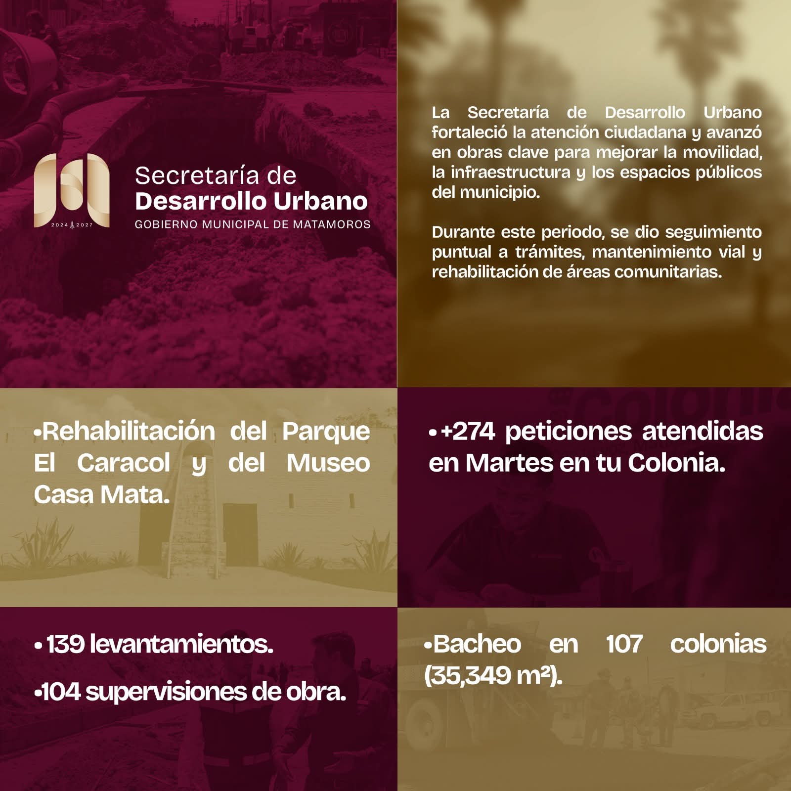 21 de Diciembre de 2025 H. Matamoros, Tamaulipas.- Bajo el liderazgo del alcalde de Matamoros, Beto Granados, la Secretaría de Desarrollo Urbano fortaleció la atención ciudadana y avanzó en obras estratégicas que mejoran la movilidad, la infraestructura y los espacios públicos del municipio, con una visión clara de transformación y desarrollo para que brille Matamoros. Dentro de los resultados destacados se puede mencionar más de 274 peticiones ciudadanas atendidas a través del programa Martes en tu Colonia, rehabilitación del parque El Caracol y del Museo Casa Mata,…