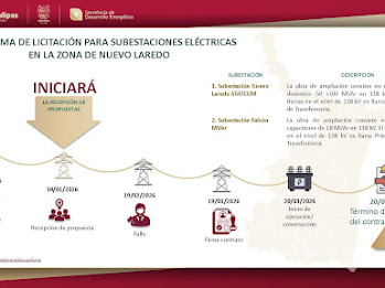 SDE-002-2026 Enero 07 de 2026 Ciudad Victoria Tamaulipas.- Como parte del compromiso estratégico de la Comisión Federal de Electricidad (CFE) para modernizar la red eléctrica nacional, se anunció el inicio del proceso de licitación para obras de infraestructura eléctrica en la ciudad fronteriza de Nuevo Laredo. El subsecretario de Electricidad y Energías Renovables de la SEDENER, Roberto Manuel Rendón, indicó que esto parte del Programa de Obras 2026, el cual tiene como objetivo principal robustecer el soporte de tensión y garantizar un suministro eléctrico de…