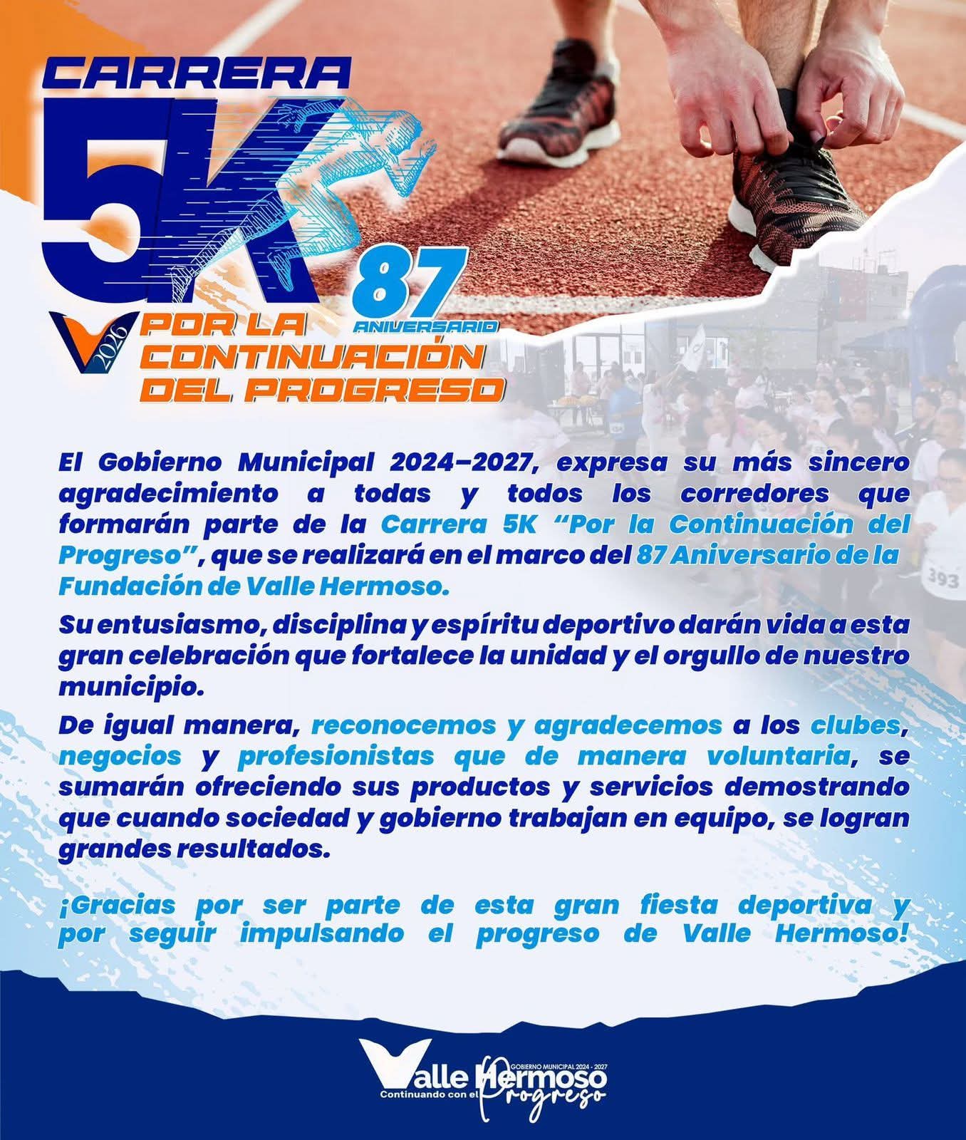 El Gobierno Municipal 2024-2027, expresa su más sincero agradecimiento a todas y todos los corredores que formarán parte de la Carrera 5K “Por la Continuación del Progreso”, que se realizará en el marco del 87 Aniversario de la Fundación de Valle Hermoso. Su entusiasmo, disciplina y espíritu deportivo darán vida a esta gran celebración que fortalece la unidad y el orgullo de nuestro municipio. De igual manera, reconocemos y agradecemos a los clubes, negocios y profesionistas que de manera voluntaria, se sumarán ofreciendo sus productos y servicios demostrando…