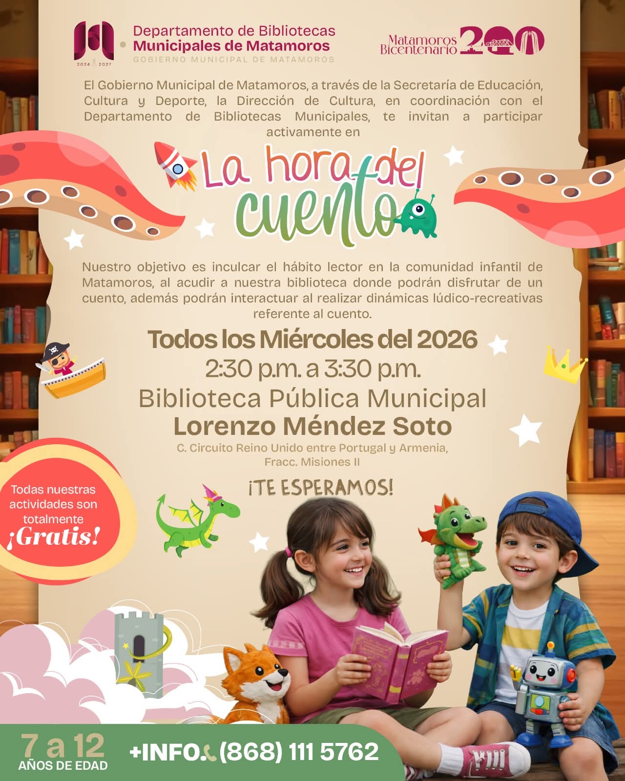 11 de febrero del 2026 Matamoros, Tam.– Como parte de las acciones para fortalecer el acceso a la cultura y fomentar el hábito de la lectura desde temprana edad, el Gobierno de Beto Granados promueve el programa “La Hora del Cuento” en la Biblioteca Pública Municipal Lorenzo Méndez Soto. Este espacio está diseñado para que niñas y niños descubran el gusto por la lectura a través de relatos, juegos y dinámicas recreativas que estimulan su imaginación, fortalecen su creatividad y refuerzan su aprendizaje de manera divertida e…