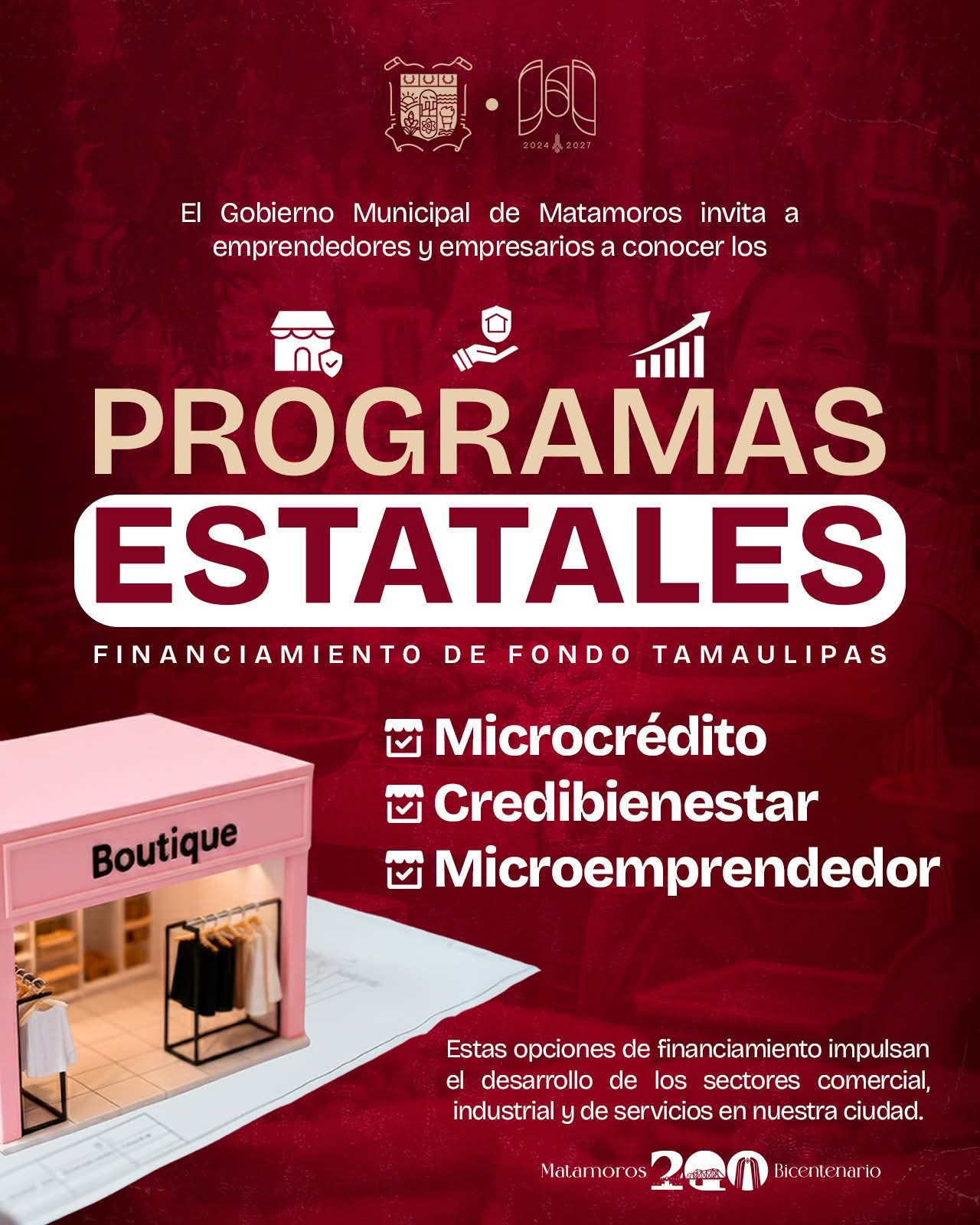 10 de febrero del 2026 Matamoros, Tam.– Con el objetivo de fortalecer el crecimiento económico y respaldar a emprendedoras, emprendedores y empresarios locales, el Gobierno Municipal de Matamoros, encabezado por el alcalde Beto Granados, invita a la ciudadanía a conocer los Programas Estatales de Financiamiento de Fondo Tamaulipas. A través de estos esquemas, se brindan opciones accesibles de apoyo económico para proyectos de los sectores comercial, industrial y de servicios, contribuyendo al desarrollo de negocios, la generación de empleo y el fortalecimiento de la economía local. …