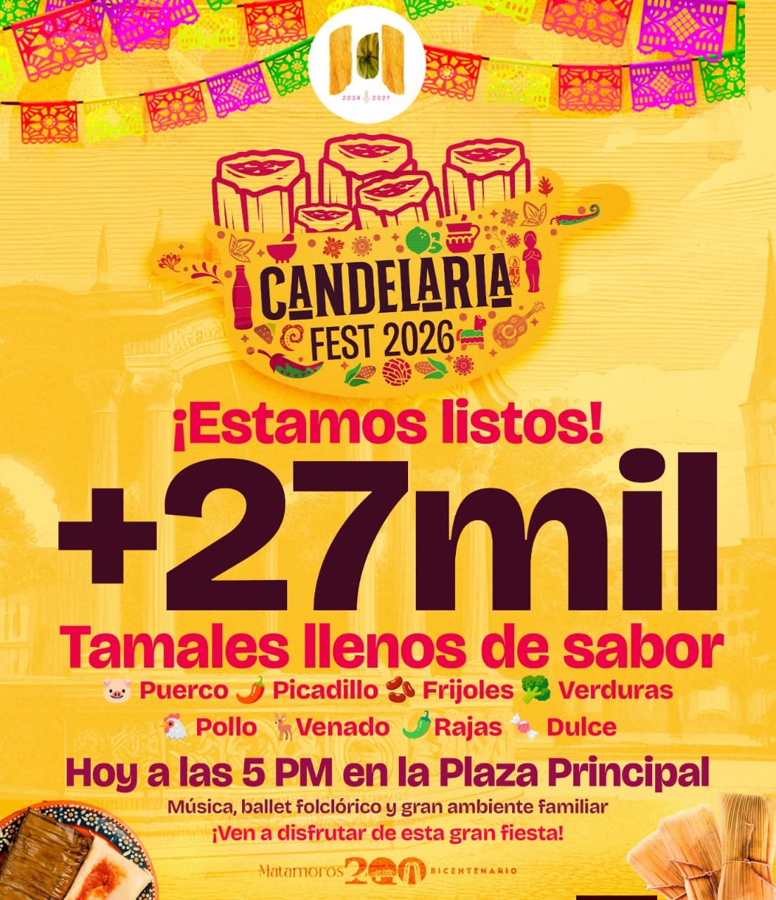 01 de febrero de 2026 H. Matamoros, Tamaulipas.- Por iniciativa del alcalde Beto Granados, el Gobierno Municipal de Matamoros invita a la ciudadanía a disfrutar del Candelaria Fest 2026, una celebración que llena de música, sabor y tradición la Plaza Principal, en el marco de las festividades del Bicentenario de Matamoros. Este gran encuentro cultural ofrece la degustación de más de 27 mil tamales, con una amplia variedad de sabores que representan nuestra riqueza gastronómica: puerco, picadillo, frijoles, verduras y dulces, preparados para conquistar todos los paladares.…