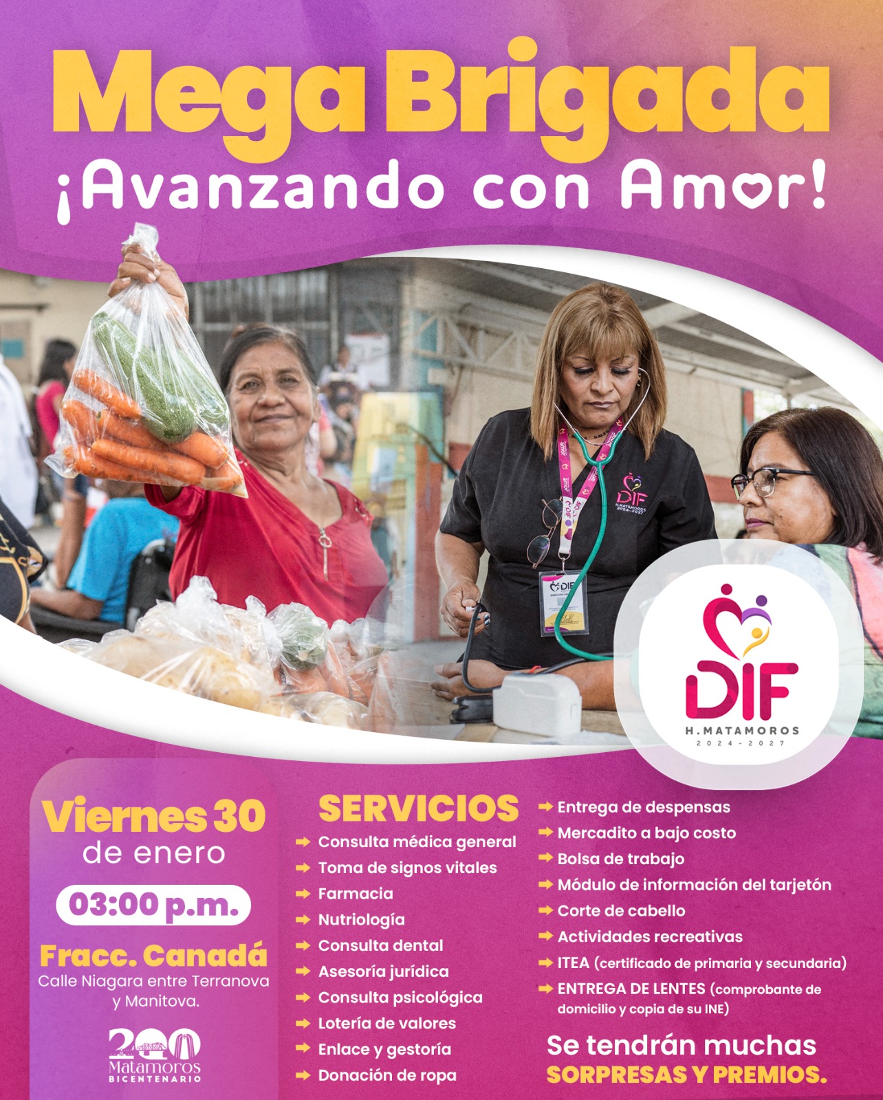 El Sistema DIF Matamoros que preside la Lic. Ana Ariceaga de Granados, invitan a las familias del Fraccionamiento Canadá y alrededores, a asistir a la Mega Brigada Asistencial, en donde se acercarán los diversos servicios que se ofrecen de manera gratuita. Esta actividad se llevará a cabo en el área verde del Fracc. Canadá ubicado en Calle Niagara entre Calle Manitova y Terranova, el día viernes 30 de enero a partir de las 03:00 de la tarde. Durante esta jornada, se ofrecerá a la población en general…