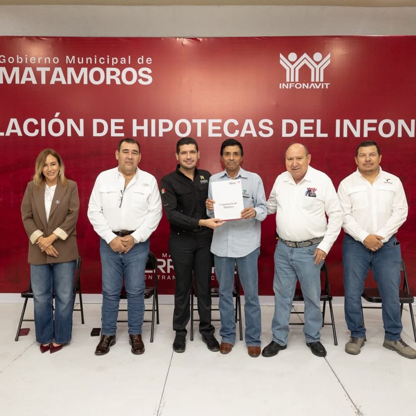 H. Matamoros, Tamaulipas.- El alcalde de Matamoros, Beto Granados, encabezó este miércoles un importante evento en el que se constató la cancelación de cerca de mil hipotecas del Instituto del Fondo Nacional de la Vivienda para los Trabajadores (Infonavit). Acompañado por el gerente del organismo en la localidad, Víctor Jaime López Guajardo, el mandatario destacó el respaldo del Gobierno de México para brindar seguridad patrimonial a las familias matamorenses.