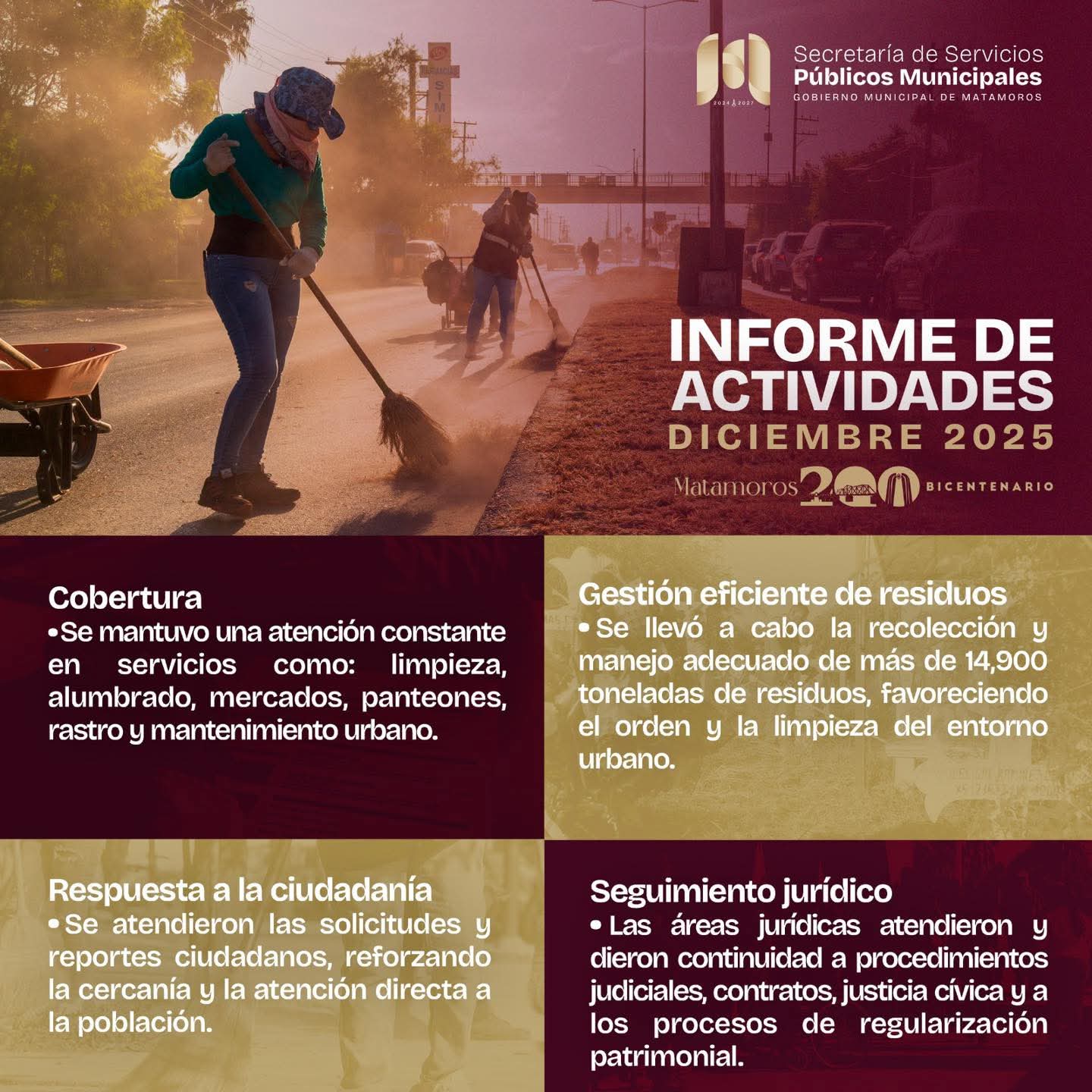 23 de enero del 2026 Matamoros, Tam.- Durante el mes de diciembre, el Gobierno de Matamoros, encabezado por el alcalde Beto Granados, mantuvo una atención constante y permanente a través de la Secretaría de Servicios Públicos en áreas clave para el funcionamiento y bienestar de la ciudad, como limpieza urbana, alumbrado público, mercados, panteones, rastro municipal y mantenimiento urbano. A lo largo de este periodo, se atendieron de manera oportuna reportes y solicitudes de la ciudadanía, fortaleciendo la cercanía entre el gobierno municipal y la población, así…