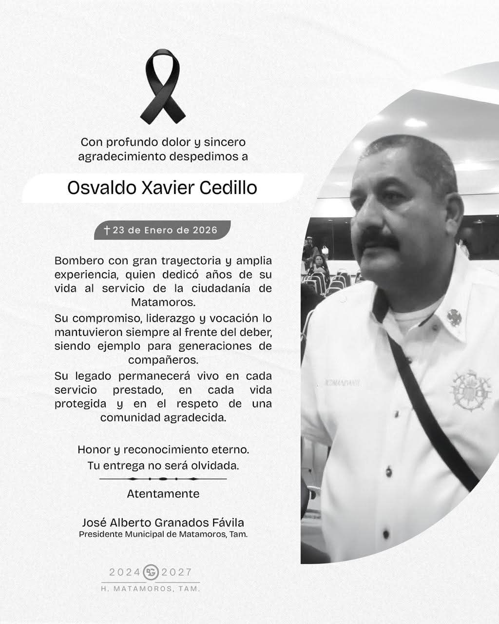 * Jefe bomberil de larga trayectoria que entregó su vida hasta el último respiro en cumplimiento de su deber H. Matamoros, Tamaulipas.- El alcalde de Matamoros, Beto Granados, expresó su más profundo dolor y consternación por el fallecimiento del Comandante en Turno Osvaldo Xavier Cedillo, ocurrido en cumplimiento de su deber, una pérdida que enluta no solo a la corporación de Bomberos, sino a toda la ciudad que hoy reconoce y honra su valentía, entrega y vocación de servicio. Con una trayectoria ejemplar y años de servicio…