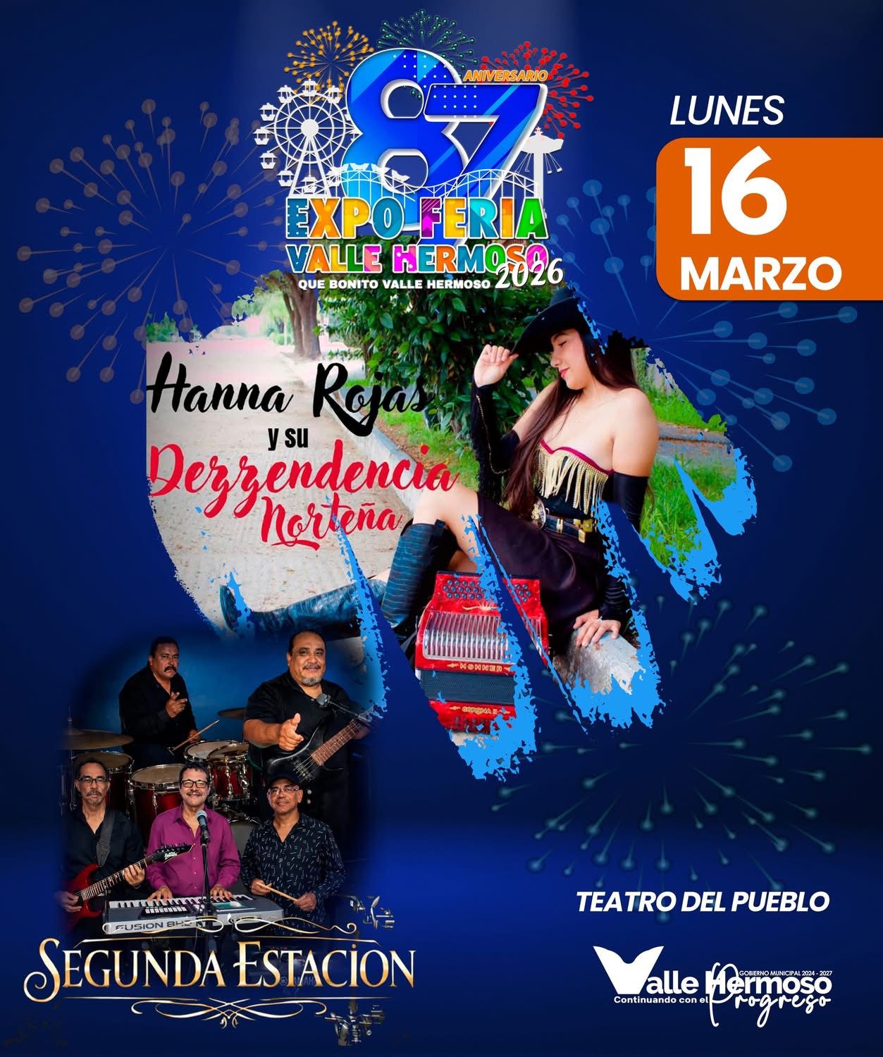 Este 16 de marzo te esperamos en el Teatro del Pueblo de la Expo Feria Valle Hermoso para disfrutar de una gran noche llena de música y ambiente familiar. A las 10:00 P.M. se presentará el grupo 2da Estación, quienes pondrán a cantar y bailar a todos los asistentes. Y para cerrar la noche con toda la energía, a las 11:30 P.M. llega Hanna Rojas y su Descendencia Norteña. ¡Ven y disfruta de esta gran celebración en el marco del 87 Aniversario de Valle Hermoso!