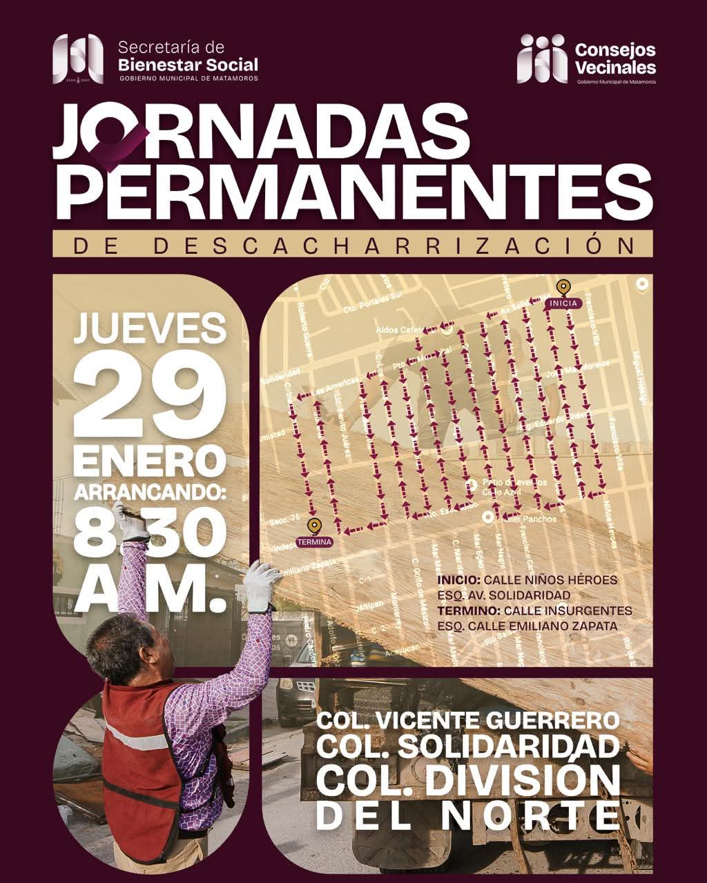 28 de enero del 2026 Matamoros, Tam.– Como parte de las acciones permanentes para proteger la salud de las familias y mantener colonias limpias y seguras, el Gobierno Municipal de Matamoros, encabezado por el alcalde Beto Granados, realizará las Jornadas Permanentes de Descacharrización, coordinadas por la Secretaría de Bienestar Social en conjunto con los Consejos Vecinales. Las labores de recolección se llevarán a cabo el jueves 29 de enero, iniciando a las 8:30 de la mañana, en las colonias Vicente Guerrero, Solidaridad y División del Norte, con…