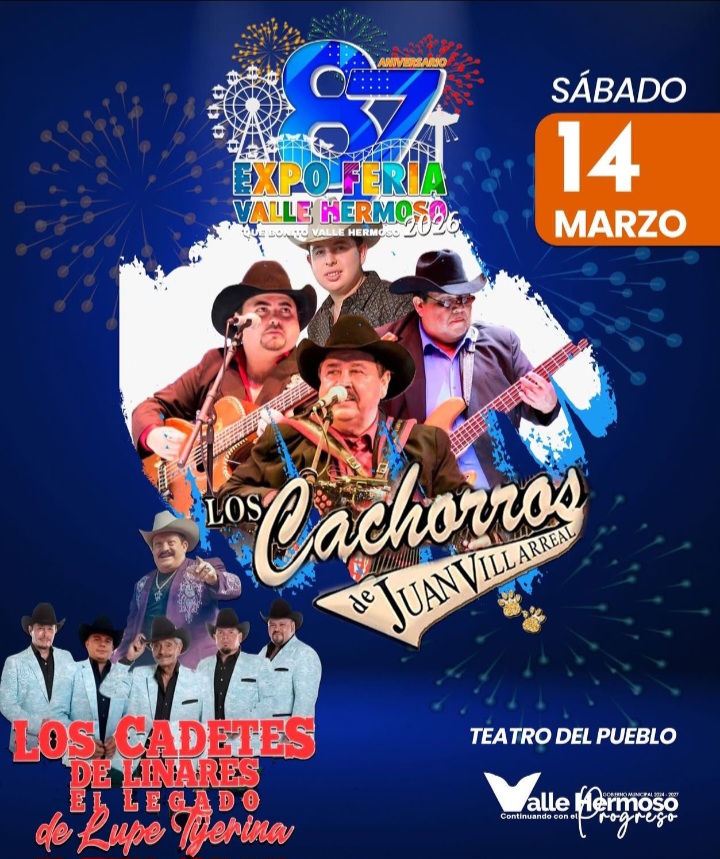 Este 14 de marzo, en el marco del 87 Aniversario de Valle Hermoso, la Expo Feria Valle Hermoso se llenará de música y gran ambiente. Contaremos con la presentación del grupo Los Cadetes de Linares, El Legado de Lupe Tijerina, quienes traerán lo mejor de su música para el disfrute de todas las familias. Y para cerrar la noche, se presentará el reconocido grupo Los Cachorros de Juan Villarreal, poniendo a todos a cantar y disfrutar de una gran velada. ¡Los esperamos para celebrar juntos nuestras tradiciones…