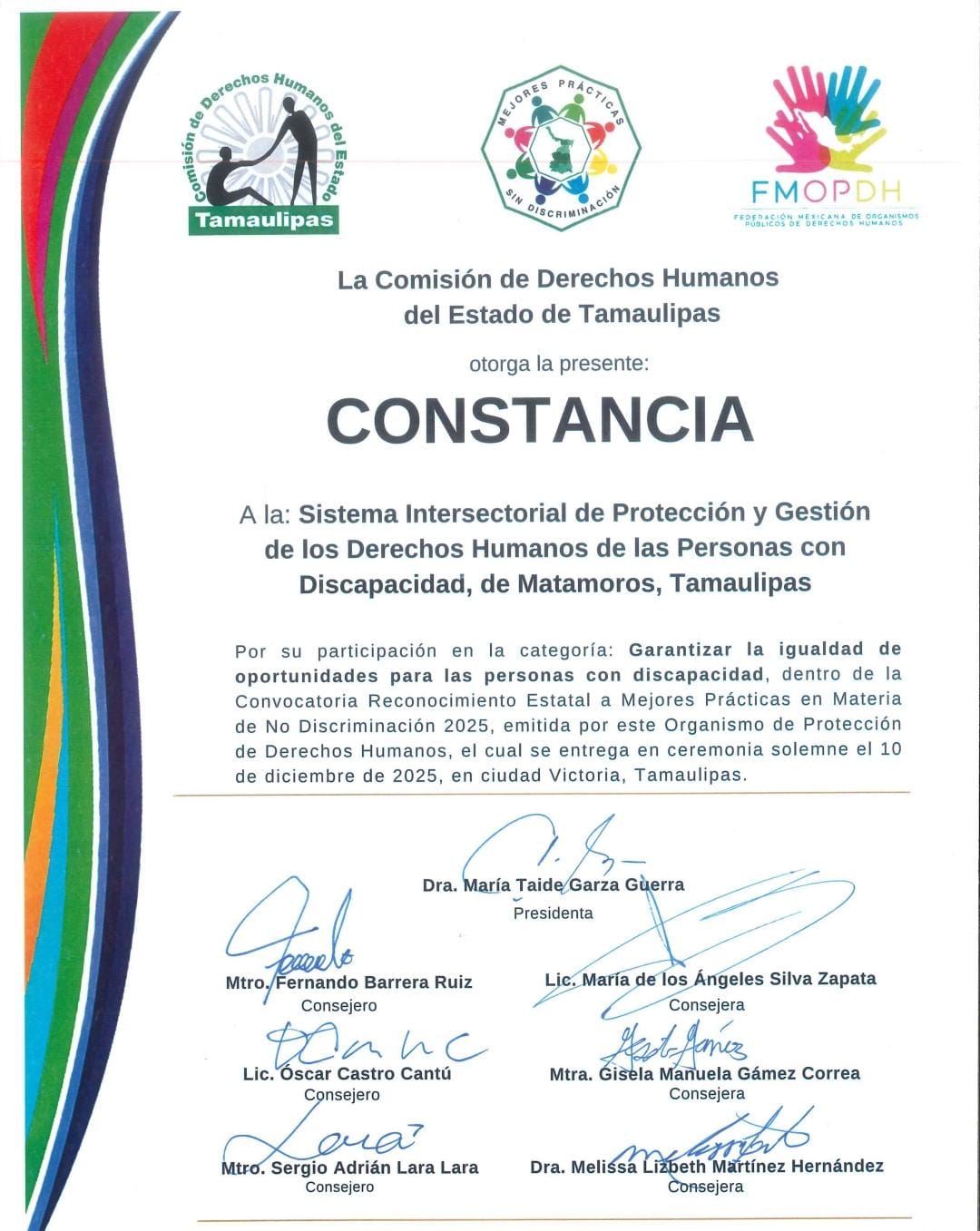 18 de Enero de 2026 H. Matamoros, Tamaulipas.- El Gobierno Municipal de Matamoros, encabezado por el alcalde Beto Granados, recibió un reconocimiento estatal por parte de la Comisión de Derechos Humanos del Estado de Tamaulipas, por las acciones encaminadas a garantizar la igualdad de oportunidades para las personas con discapacidad. Este logro, obtenido a través del Sistema Intersectorial de Protección y Gestión de Derechos Humanos, refleja el compromiso de la administración municipal de seguir impulsando políticas públicas que promuevan la inclusión, la no discriminación y el respeto…