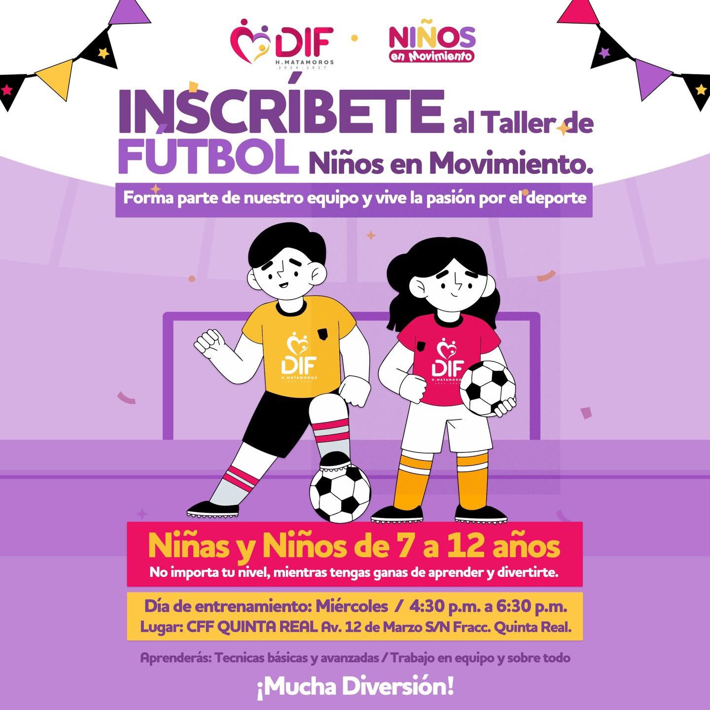 Promoviendo espacios de recreación para los menores, el Sistema DIF y el Gobierno Municipal de Matamoros en coordinación con el Programa “Niños en Movimiento” invitan a las niñas y niños entre 7 a 12 años a formar parte del taller de fútbol, en donde aprenderán y se divertirán a través del deporte. Los entrenamientos se lleván a cabo todos los miércoles en horario de 04:30 a 06:30 p.m., en el Centro del Fortalecimiento Familiar Quinta Real. Durante estas clases, los pequeños aprenderán técnicas básicas y avanzadas de fútbol…