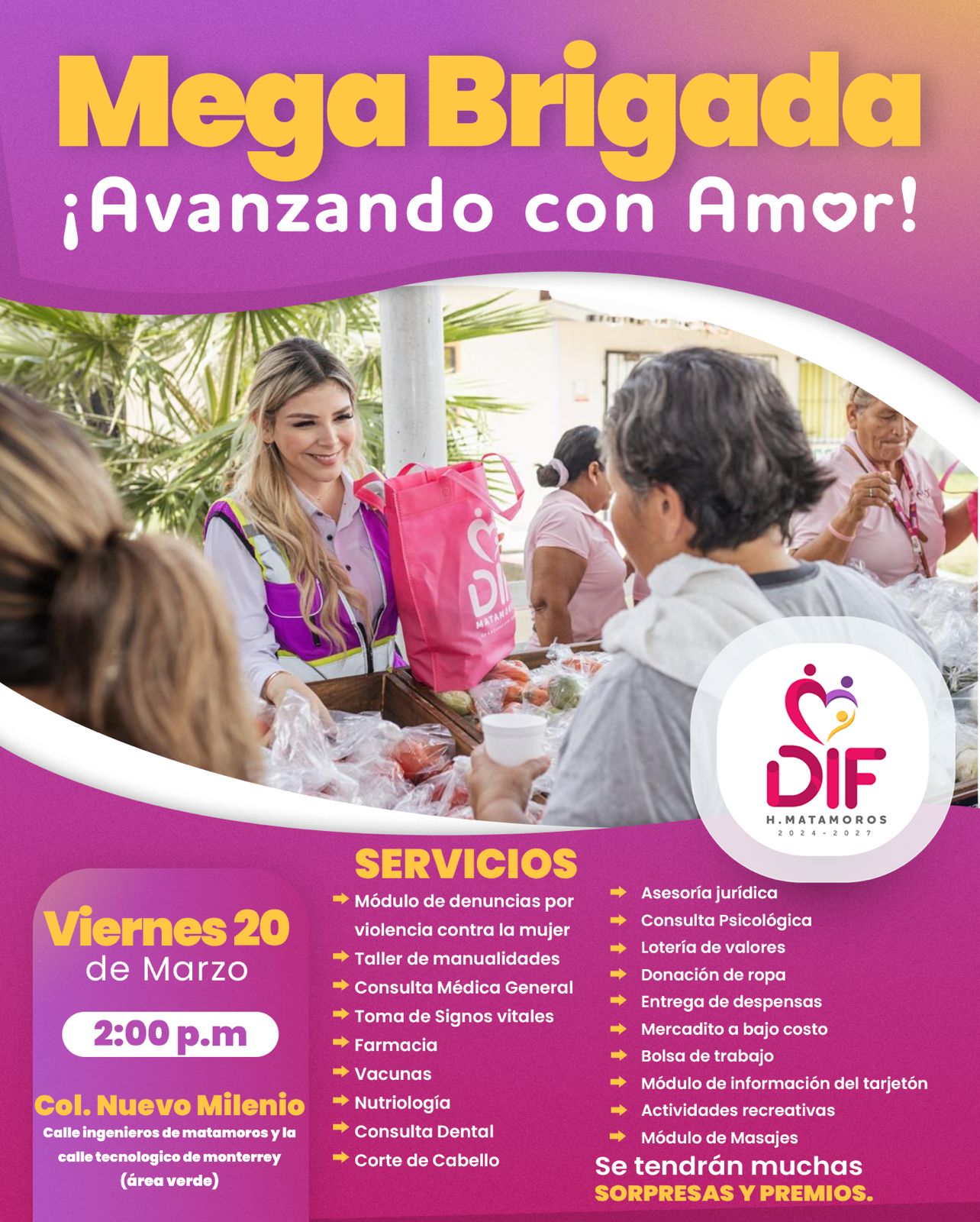 El Gobierno Municipal y el Sistema DIF Matamoros, en coordinación con el Instituto de la Mujer, la Secretaría de Bienestar Social y el IMSS, extiende una cordial invitación a la ciudadanía para asistir y beneficiarse con la Mega Brigada que se llevará a cabo en la colonia Nuevo Milenio. Esta iniciativa tiene como propósito acercar servicios de asistencia social que fomenten la atención directa, el bienestar integral y el cuidado de la salud de las familias. La jornada se realizará el viernes 20 de marzo, en el área…