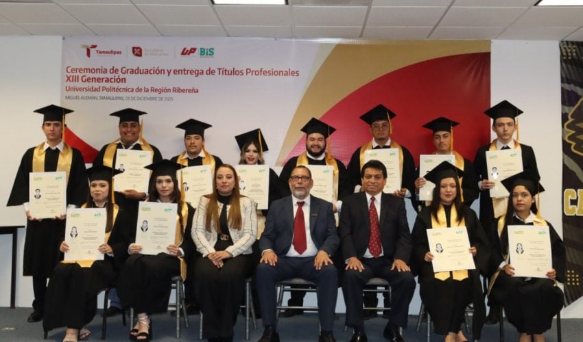 UPR-001-2026 Enero 08 de 2026 Miguel Alemán, Tamaulipas.– La Universidad Politécnica de la Región Ribereña (UPRR) entregó a la sociedad una nueva generación de profesionistas al celebrar la ceremonia de graduación de la XIII Generación 2021–2025 de los tres programas educativos que conforman la institución. Héctor Diez Rodríguez, rector de la universidad, señaló que un total de 39 graduados recibieron sus títulos profesionales, reflejo del esfuerzo, la constancia y el compromiso demostrados a lo largo de su trayectoria universitaria, así como del acompañamiento académico brindado por la comunidad educativa de…