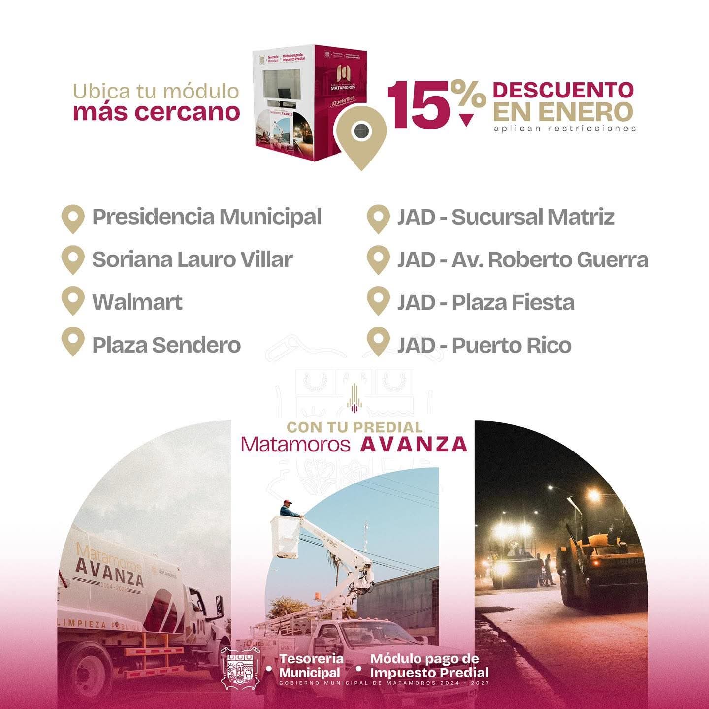 05 de Enero de 2026 H. Matamoros, Tamaulipas.- Por instrucción del alcalde de Matamoros, Beto Granados, el Gobierno Municipal activó módulos de pago del Impuesto Predial en distintos puntos de la ciudad, con el objetivo de acercar este servicio a la ciudadanía y facilitar el cumplimiento de esta contribución. Durante el mes de enero, los contribuyentes pueden aprovechar un 15 por ciento de descuento en el pago del impuesto predial, apoyando directamente a que Matamoros continúe avanzando como un territorio en transformación. La aportación ciudadana…