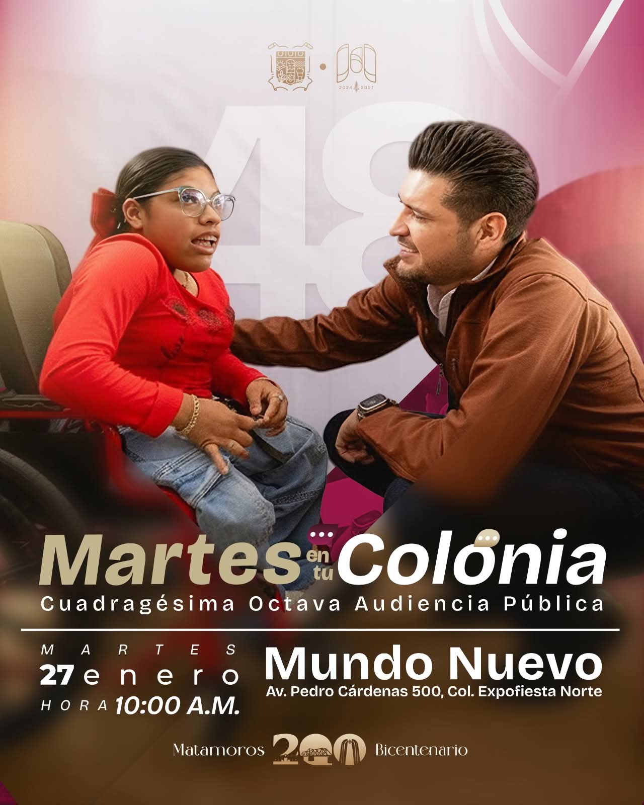 – Acudirá a Matamoros el secretario de Educación en Tamaulipas, Miguel Ángel Valdez García 26 de enero del 2026 Matamoros, Tam.- El Gobierno Municipal de Matamoros, encabezado por el presidente municipal José Alberto Granados Fávila, realizará este martes 27 de enero una nueva jornada del programa “Martes en tu Colonia”, en el Centro de Convenciones Mundo Nuevo, como parte de su política de atención directa y cercanía con la ciudadanía. En su cuadragésima octava edición, esta Audiencia Pública se consolida como un espacio abierto, accesible…