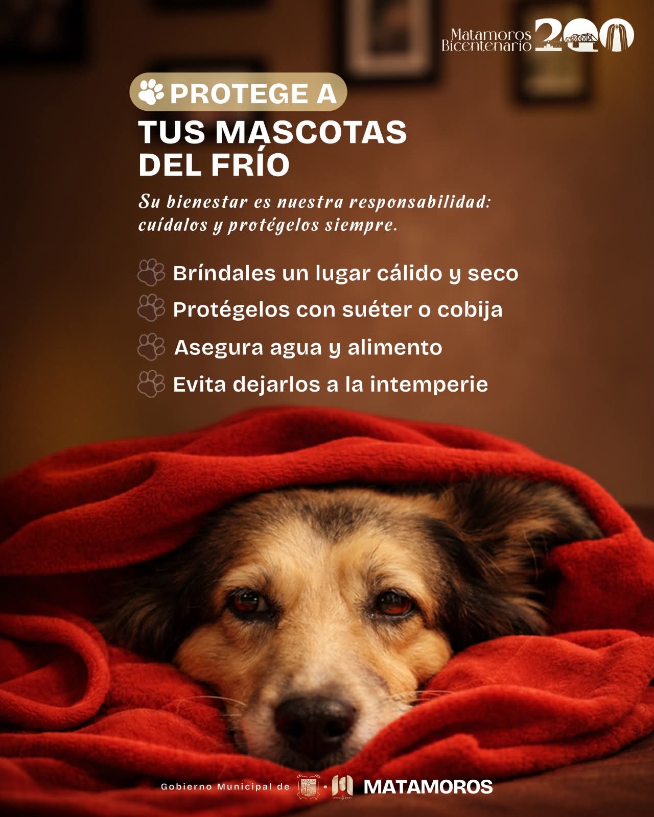 25 de enero del 2026 Matamoros, Tam.- Ante el pronóstico de bajas temperaturas para este fin de semana, el Gobierno de Beto Granados hizo un llamado a la ciudadanía para reforzar el cuidado de las mascotas, recordando que el frío puede afectar seriamente su salud si no se toman las medidas adecuadas. La administración municipal exhortó a las familias a brindar a perros y gatos un espacio cálido y seco, protegerlos con suéter o cobija, así como garantizarles agua y alimento suficientes. Asimismo, se pidió evitar dejarlos…