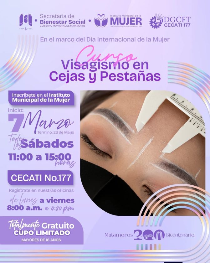 H. Matamoros, Tamaulipas.- El Gobierno de Matamoros, encabezado por el alcalde Beto Granados, a través del Instituto Municipal de la Mujer, invita a la ciudadanía a participar en el Curso de Visagismo en Cejas y Pestañas, una capacitación práctica enfocada en el diseño y realce de cejas y pestañas de acuerdo con el tipo de rostro, impulsando habilidades que pueden convertirse en una fuente de autoempleo.