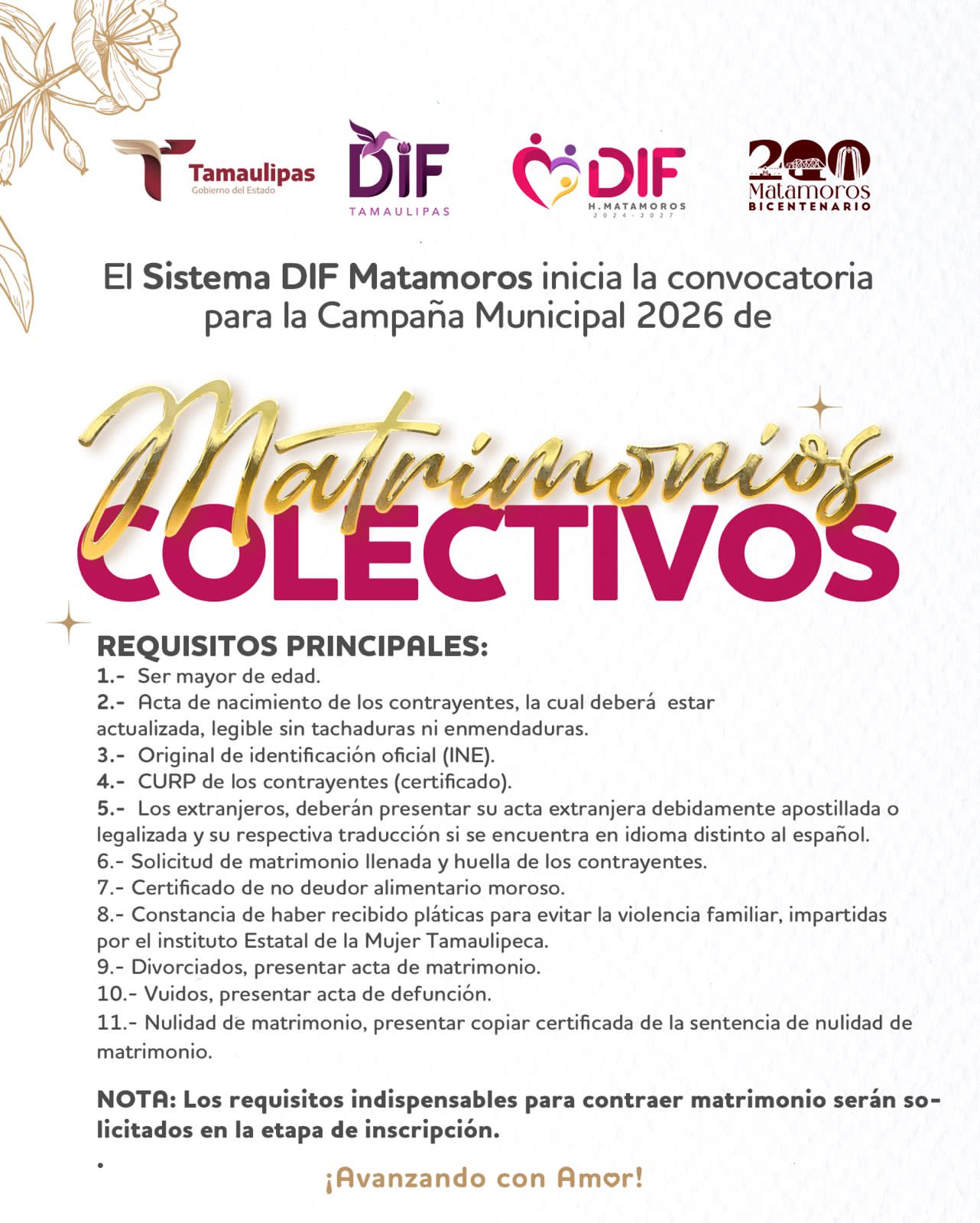 El Sistema DIF Matamoros que encabeza la Lic. Ana Ariceaga de Granados, continúa haciendo la invitación a todas las parejas interesadas en formalizar su unión, a formar parte de la Campaña Municipal de Matrimonios Colectivos 2025. Esta iniciativa tiene como objetivo promover la certeza jurídica, la estabilidad, y el fortalecimiento de los lazos familiares, ya que un matrimonio legal no solo brinda los derechos correspondientes y responsabilidad, si no que da protección a los hijos, acceso a los beneficios sociales y seguridad patrimonial a los cónyuges. …