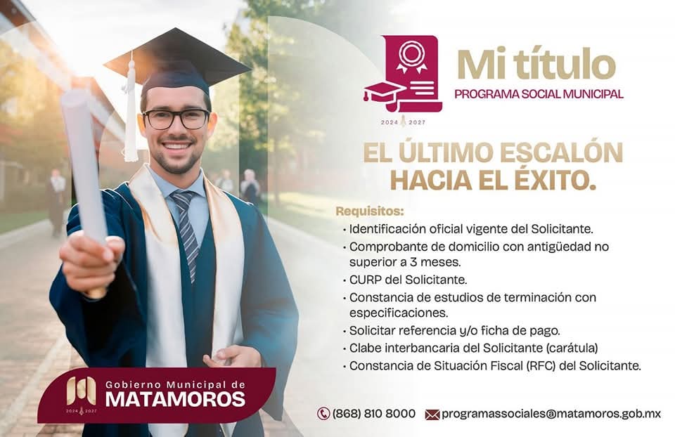 16 de Noviembre de 2025 H. Matamoros, Tamaulipas.- El Gobierno Municipal, encabezado por el alcalde Beto Granados, continúa impulsando acciones para fortalecer el desarrollo profesional de los ciudadanos. Conscientes de que concluir el proceso de titulación es un paso decisivo para acceder a mejores oportunidades laborales, se pone a disposición el programa “Mi Título”, una iniciativa diseñada para brindar apoyo económico a quienes están próximos a titularse. A través de este programa, se podrá recibir un incentivo económico destinado a cubrir los costos asociados a la titulación universitaria o…