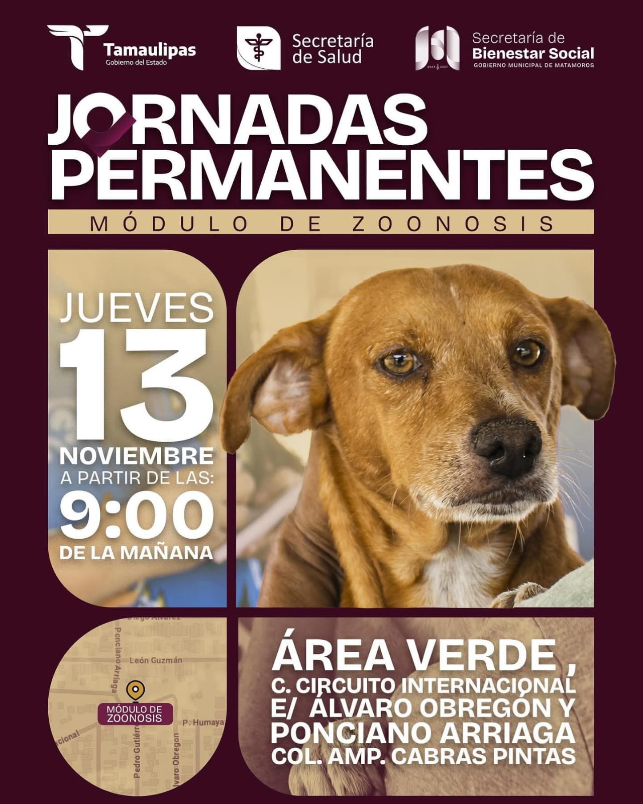 13 de Noviembre de 2025 H. Matamoros, Tamaulipas.- El municipio de Matamoros, bajo la presidencia de Beto Granados y en coordinación con la Tercera Jurisdicción Sanitaria, continúa promoviendo la salud de las familias y sus mascotas. En esta ocasión, se llevará a cabo una brigada de vacunación antirrábica en la colonia Ampliación Cabras Pintas, a partir de las 9:00 de la mañana de hoy jueves 13 de Noviembre, con el propósito de proteger a los animales de compañía y prevenir la propagación de enfermedades. Durante…
