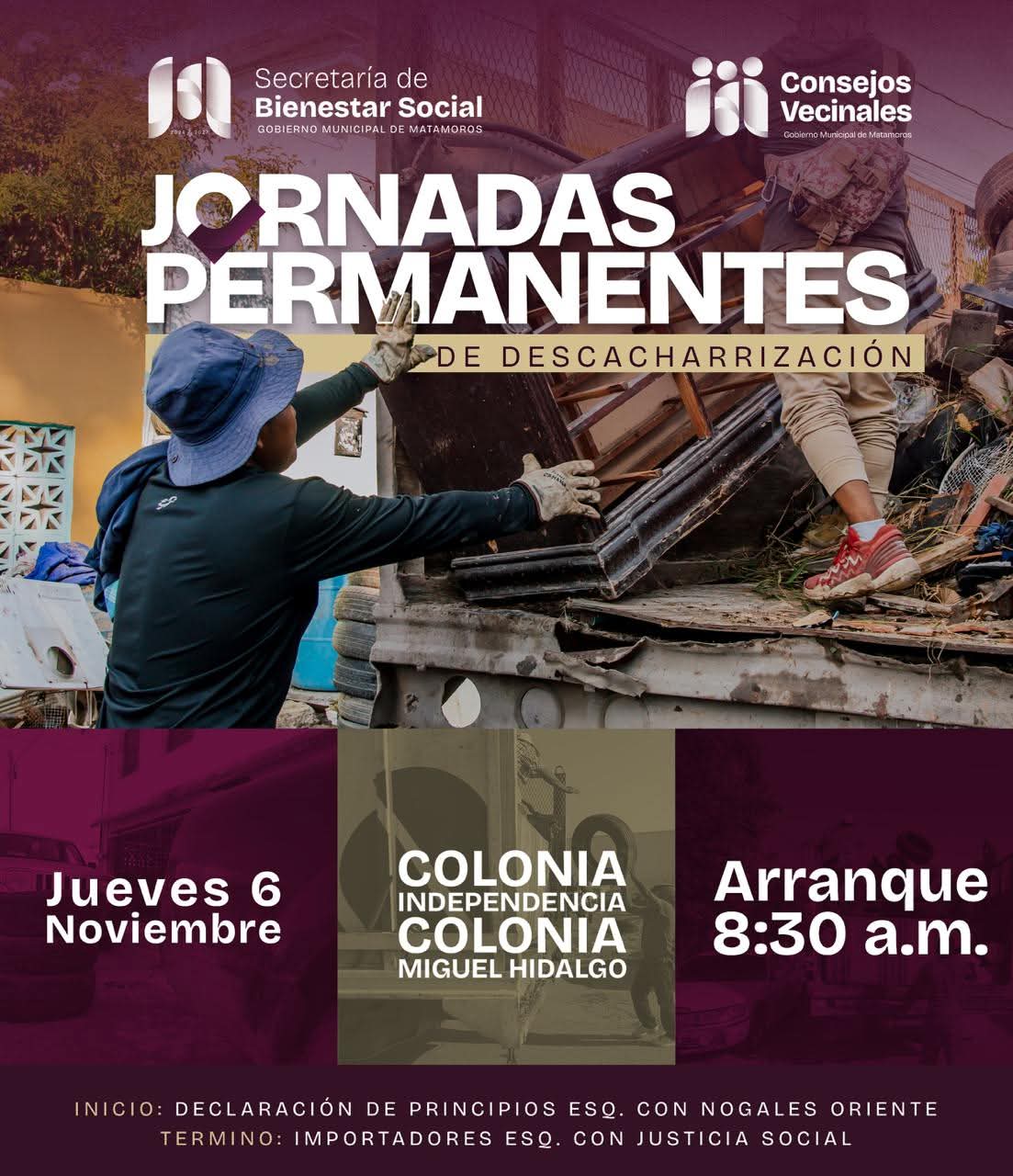 06 de Noviembre de 2025 H. Matamoros, Tamaulipas.- Las jornadas permanentes de descacharrización continúan llegando a más colonias de Matamoros, reforzando las acciones del Gobierno Municipal que encabeza el alcalde Beto Granados para mantener una ciudad más limpia y saludable. Este jueves 6 de noviembre, a partir de las 8:30 de la mañana las cuadrillas recorrerán las colonias Independencia y Miguel Hidalgo, trabajando de la mano con los vecinos para retirar objetos en desuso, prevenir criaderos de mosquitos y reducir riesgos de enfermedades. Darán inicio en…