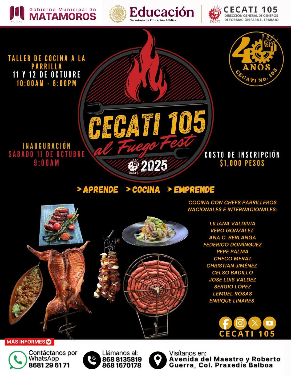 H. Matamoros, Tamaulipas.- El Gobierno de Beto Granados extiende una cordial invitación a toda la comunidad a participar en el “Al Fuego Fest 2025”, un evento culinario organizado por el CECATI No. 105 en el marco de su 40 aniversario. La cita será los días 11 y 12 de octubre, de 10:00 a.m. a 8:00 p.m., en las instalaciones del plantel ubicado en Avenida del Maestro y Roberto Guerra, Colonia Práxedis Balboa. Durante este festival gastronómico se llevará a cabo un exclusivo Taller de Cocina a la Parrilla,…