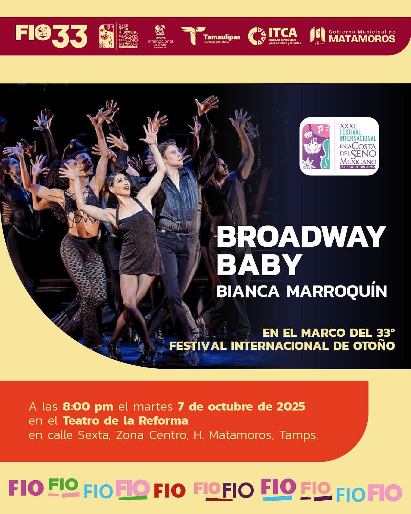 07 de octubre 2025 Matamoros, Tam.- En el marco del Festival Internacional de la Costa del Seno Mexicano, el Gobierno de Beto Granados invita a las y los matamorenses a disfrutar del espectacular show “Broadway Baby”, protagonizado por la reconocida artista Bianca Marroquín, quien deleitará al público con una presentación llena de talento, música y emoción. El evento se llevará a cabo este martes 7 de octubre de 2025, en punto de las 8:00 p.m., en el Teatro de la Reforma, ubicado en Calle Sexta, Zona Centro,…