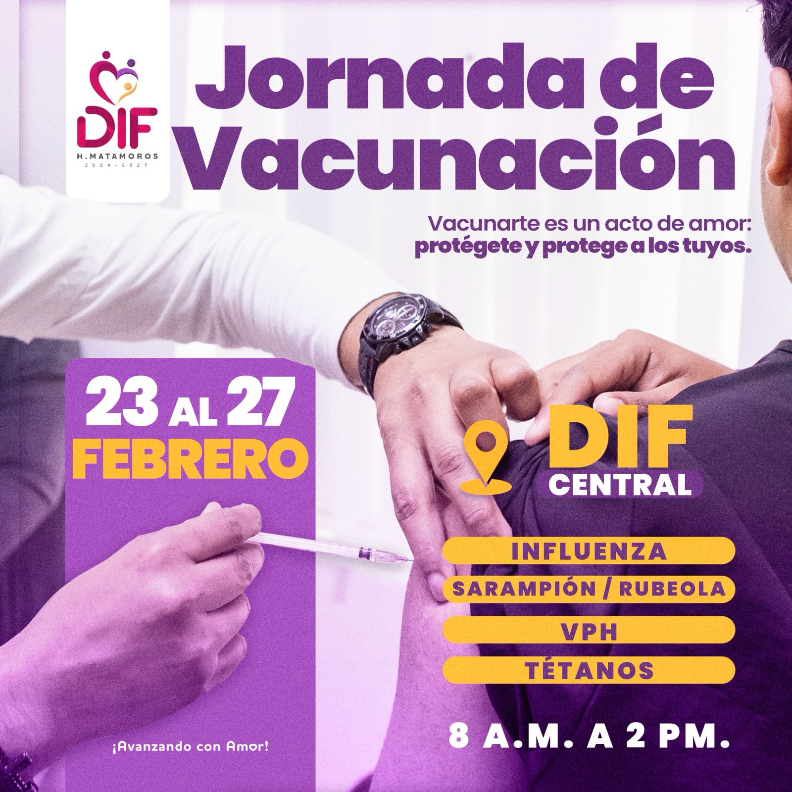 Dando continuidad a la atención integral de las familias, el Sistema DIF Matamoros, a través del Departamento de Salud, amplia las fechas de la Jornada de Vacunación, con el propósito de fortalecer las acciones orientadas a la prevención de enfermedades. Los módulos estarán disponibles para la población en general, con el objetivo de acercar servicios médicos esenciales que permitan completar y reforzar esquemas de inmunización. La jornada se realizará del 23 al 27 de febrero en la oficina central del organismo, ubicada en Calle 4ta. y Camilo Manzo,…