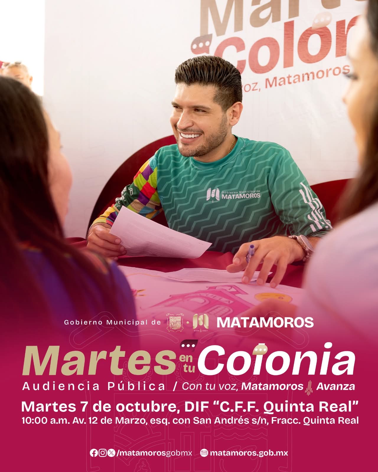 *Este “Martes en tu colonia” se lleva a cabo en el DIF Centro de Fortalecimiento Familiar de Quinta Real* 07 de Octubre de 2025 H. Matamoros, Tamaulipas.- El alcalde Beto Granados encabezará este “Martes en tu colonia”, realizado en el DIF Centro de Fortalecimiento Familiar de Quinta Real, ubicado en 12 de marzo, esquina con San Andrés . Este martes 7 de octubre, a partir de las 10:00 de la mañana, se abren las puertas al diálogo para escuchar y atender las necesidades de la población. …