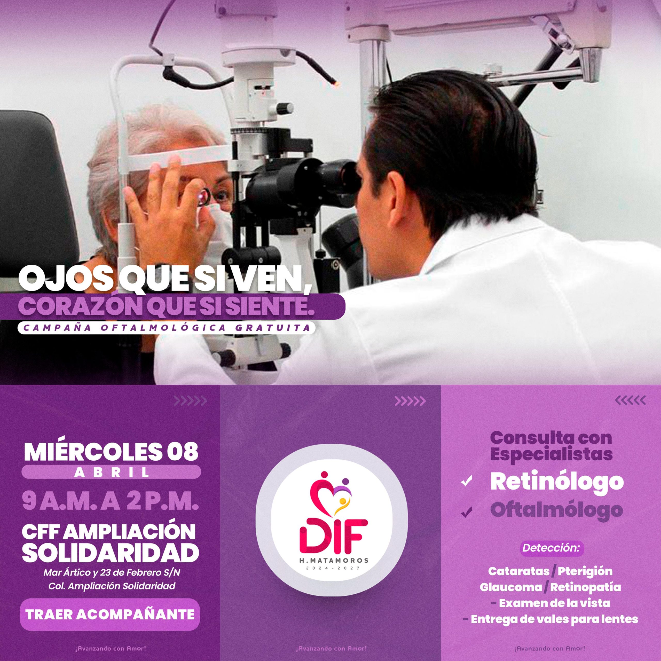 Con el firme objetivo de mejorar la salud visual de las familias matamorenses, la Lic. Ana Ariceaga de Granados, Presidenta del Sistema DIF Matamoros, lanzó una invitación abierta a la ciudadanía para participar en la campaña permanente “Ojos que sí ven, Corazón que sí siente”. Esta jornada de salud ofrecerá valoraciones oftalmológicas de manera totalmente gratuita para detectar y atender diversos padecimientos visuales. La cita es el próximo miércoles 08 de abril de 2026 en las instalaciones del CFF Ampliación Solidaridad, ubicado en la intersección de las calles…