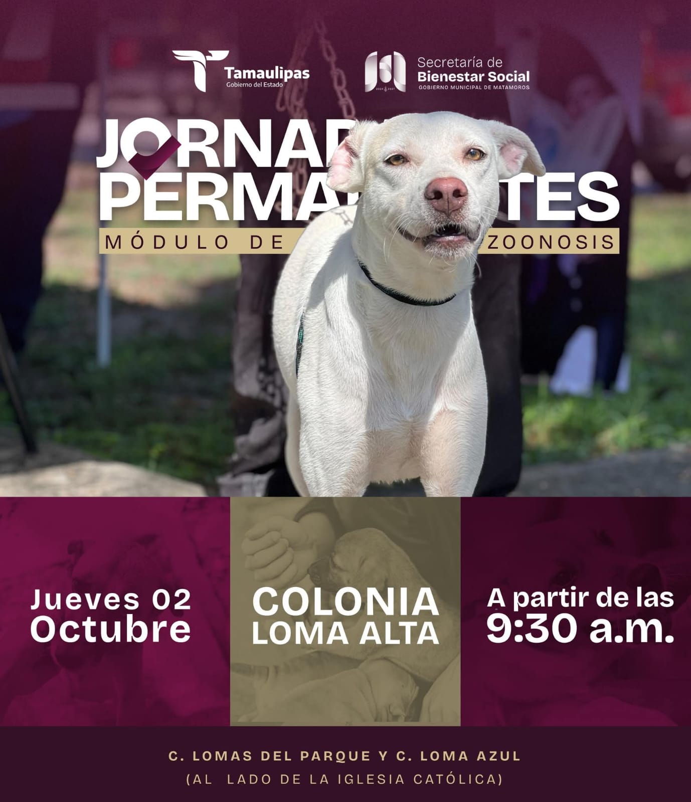 02 de Octubre de 2025 H. Matamoros, Tamaulipas.- El gobierno de Matamoros sigue acercando servicios que cuidan tanto de nuestras mascotas como de la salud de la comunidad. Hoy, la colonia Loma Alta será sede de la jornada permanente del módulo de zoonosis, a partir de las 9:30 de la mañana. Se invita a todas las familias a llevar a sus mascotas para recibir atención y orientación que promuevan su bienestar, además de prevenir enfermedades que afectan tanto a los animales como a las personas. …