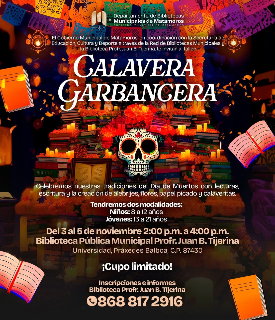 20 de Octubre de 2025 H. Matamoros, Tamaulipas.- El Gobierno Municipal, encabezado por el alcalde Beto Granados, invita a niñas, niños y jóvenes al taller “Calavera Garbancera”, donde podrán disfrutar de actividades llenas de color, lectura y creatividad. Durante tres días, los participantes elaborarán alebrijes, flores de papel, papel picado y calaveritas, fomentando el amor por nuestras tradiciones mexicanas. Será del 3 al 5 de noviembre, de 2:00 a 4:00 de la tarde, en la Biblioteca Pública Municipal Prof. Juan B. Tijerina Esta iniciativa forma parte…