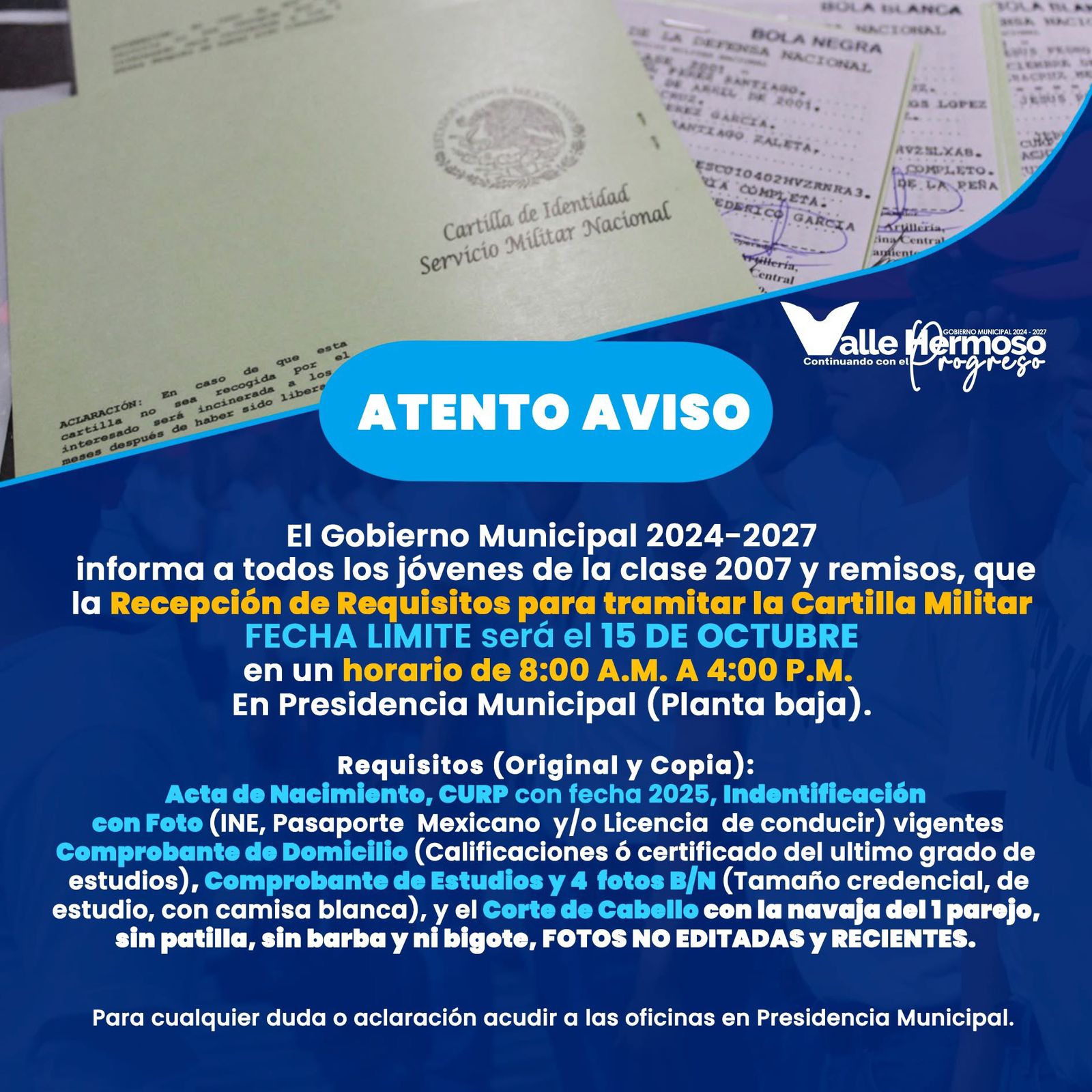 ATENTO AVISO: El Gobierno Municipal 2024 – 2027 informa a todos los jóvenes de la clase 2007 y remisos, que la Recepción de Requisitos para tramitar la Cartilla Militar tendrá como fecha limite el 15 de Octubre en un horario de 8:00 A.M. a 4:00 P.M. en Presidencia Municipal.