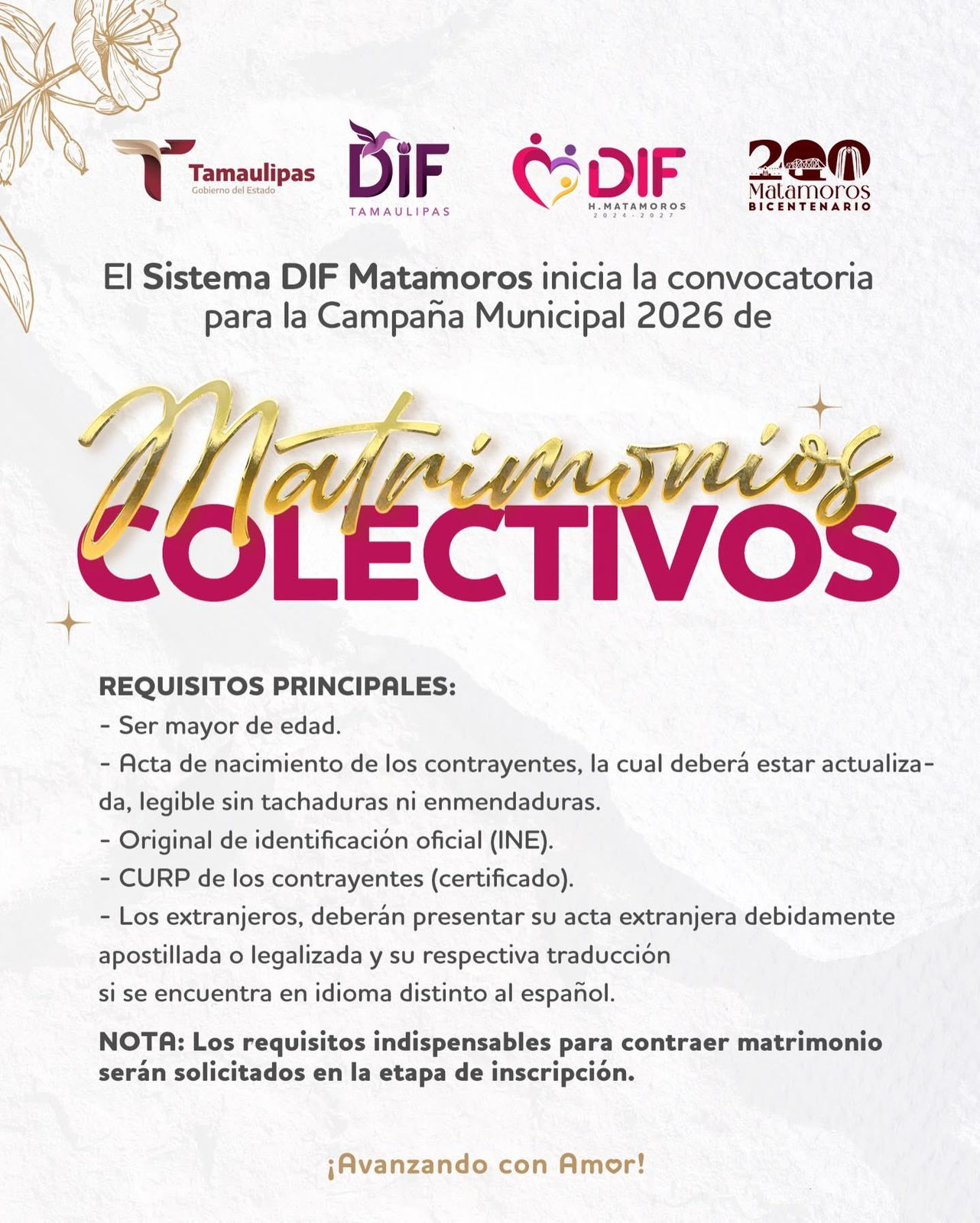 Con el firme objetivo de brindar certeza jurídica a las familias matamorenses, el Sistema DIF Matamoros mantiene abierta la convocatoria para la Campaña de Matrimonios Colectivos, una iniciativa realizada en estrecha coordinación con el Sistema DIF Tamaulipas y el Gobierno del Estado. La Lic. Ana Ariceaga de Granados, Presidenta del Sistema DIF Matamoros, hizo un llamado a las parejas que viven en unión libre o que desean formalizar su relación, destacando que aún se encuentran en la etapa de preinscripción. “Aún estás a tiempo de traer tus…
