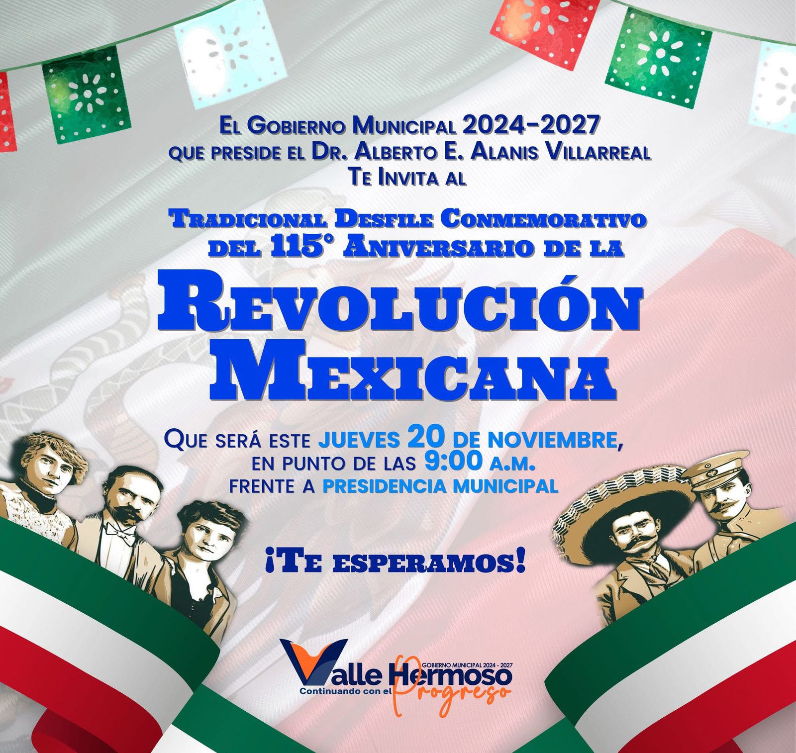 El Gobierno Municipal 2024 – 2027 que preside el Dr. Alberto E. Alanis Villarreal, te invita al Tradicional Desfile Conmemorativo del 115° Aniversario de la Revolución Mexicana. Este Jueves 20 de Noviembre, en punto de las 9:00 A.M. frente a Presidencia Municipal. ¡TE ESPERAMOS!