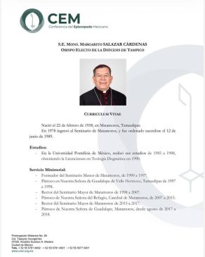 La Conferencia del Episcopado Mexicano informó la designación de S.E. Mons. Margarito Salazar Cárdenas como Obispo Electo de la Diócesis de Tampico, un nombramiento que reconoce una trayectoria de más de tres décadas al servicio pastoral y formativo de la Iglesia en el noreste del país