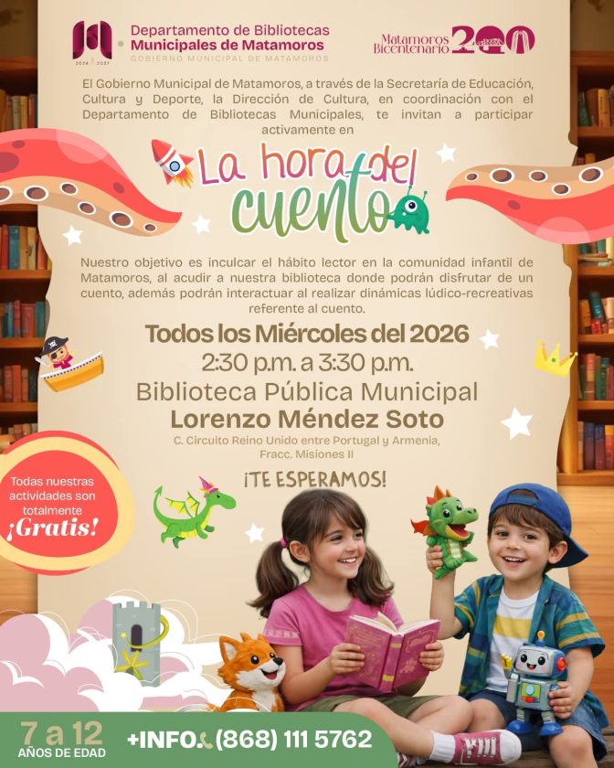 Matamoros, Tam.– Como parte de las acciones para fortalecer el acceso a la cultura y fomentar el hábito de la lectura desde temprana edad, el Gobierno de Beto Granados promueve el programa “La Hora del Cuento” en la Biblioteca Pública Municipal Lorenzo Méndez Soto.