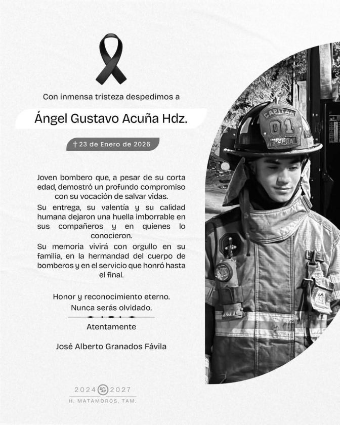 Matamoros, Tam.- El alcalde de Matamoros, Beto Granados, expresó su más profundo pesar por el fallecimiento del joven bombero Ángel Gustavo Acuña Hernández, ocurrido este 23 de enero de 2026, lamentando una pérdida que enluta no solo a su familia, sino a toda la comunidad y al Heroico Cuerpo de Bomberos. Con inmensa tristeza, el edil reconoció que se va un servidor público que, pese a su corta edad, demostró un compromiso ejemplar con la noble vocación de salvar vidas.