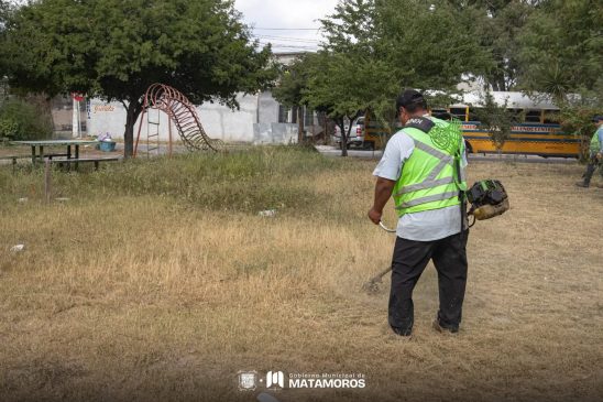 Matamoros, Tam.- El Gobierno de Beto Granados llevó a cabo labores de limpieza y mantenimiento en el área verde de la colonia Lucio Blanco, a través de la cuadrilla Renace, con el propósito de conservar en óptimas condiciones este espacio público utilizado diariamente por niñas, niños y familias de la zona.